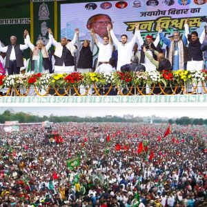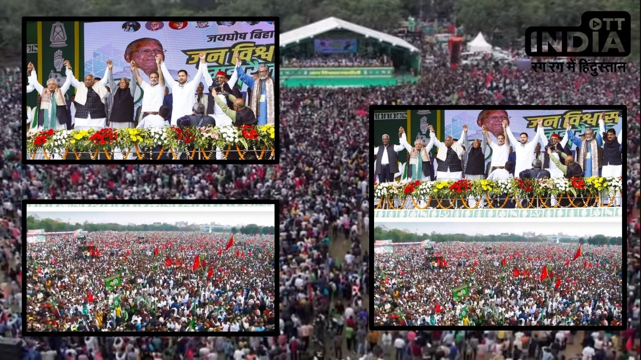 INDIA Alliance: बिहार पटना में विपक्षी गठबंधन (INDIA) की एक बड़ी रैली हुई। इस रैली में लाखों लोग पहुंचे। इस महारैली का आयोजन राजद, वामदल और कांग्रेस की तरफ से मिलकर किया गया था। इस दौरान खराब मौसम के बाद भी भारी संख्या में लोग ऐतिहासिक गांधी मैदान में नेताओं को सुनने के लिए खड़े रहे। यह भी पढ़े: यूपी की 23 सीटों पर सपा भाजपा के बीच टक्कर, राजनाथ का रविदास से मुकाबला रैली लालू प्रसाद यादव बोले इस रैली (INDIA) में कांग्रेस नेता राहुल गांधी, कांग्रेस के अध्यक्ष मल्लिकार्जुन खरगे, राष्ट्रीय जनता दल के अध्यक्ष लालू प्रसाद यादव, समाजवादी पार्टी अध्यक्ष अखिलेश यादव, मार्क्सवादी कम्युनिस्ट पार्टी के नेता सीताराम येचुरी जन विश्वास रैली में शामिल हुए। इस रैली को संबोधित करते हुए लालू प्रसाद यादव ने कहा कि गांधी मैदान की इस रैली से मैं ये आह्वान करता हूं कि आने वाले लोकसभा के चुनाव में हम भाजपा को नेस्तनाबूद कर देंगे। यह भी पढ़े: हैदराबाद में माधवी लता बनाम असदुद्दीन ओवैसी, बीजेपी को नए चेहरे पर भरोसा