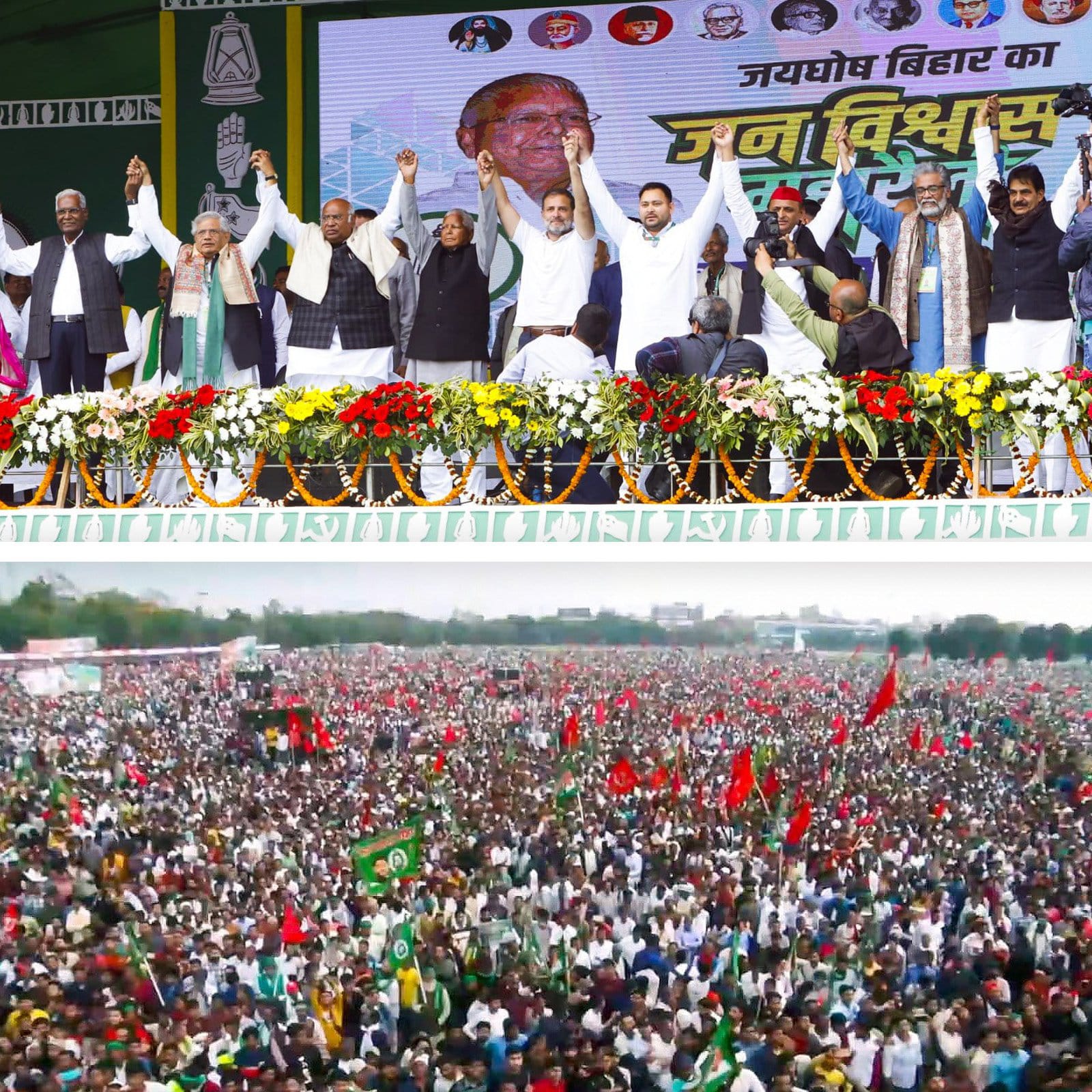कांग्रेस अध्यक्ष मल्लिकार्जुन खरगे ने कहा प्रधानमंत्री मोदी के राज्य में पिछले 3 सालों में 25 हजार लोग खुद कुशी कर चुके हैं, क्योंकि नौकरी नहीं है, खाने के लिए अन्न नहीं है, फिर भी प्रधानमंत्री मोदी कहते हैं, मोदी की गारंटी, आपकी गारंटी क्या है सबको मालूम है, सबको धोखा देना आपकी गारंटी है। वहीं अखिलेश यादव ने कहा, एक तरफ उत्तर प्रदेश 80 हराओ का नारा दे रहा है, तो बिहार 40 हराओ का नारा लगा रहा है। अगर यूपी और बिहार मिलकर 120 सीटें हरा देंगे तो भाजपा का क्या होगा ? यह भी पढ़े: भाजपा ने बॉलीवुड से लेकर भोजपुरी सिनेमा के इन सितारों को बनाया उम्मीदवार…नौकरी मतलब तेजस्वी के लगे नारे