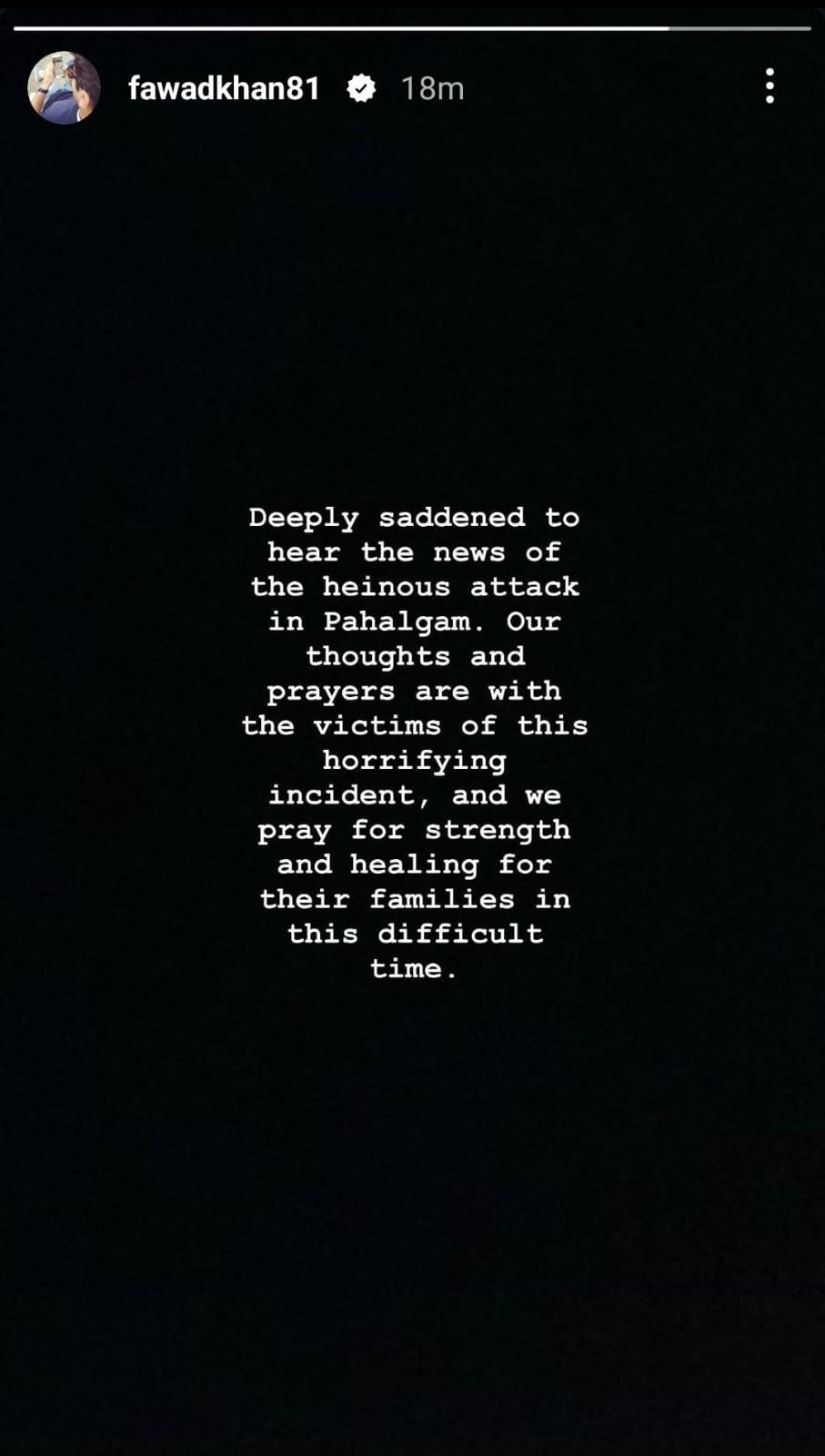 बता दें कि पहलगाम में आतंकवादियों द्वारा मारे गए 26 हिंदुओं के प्रति फवाद ने दुख और अपनी संवेदनाएं जताई थीं। उन्होंने अपनी इंस्टा स्टोरी में लिखा था, "पहलगाम में हुए जघन्य हमले की खबर सुनकर बहुत दुखी हूं। हमारी संवेदनाएं और प्रार्थनाएं इस घटना के पीड़ितों के साथ हैं और हम इस कठिन समय में उनके परिवारों के लिए शक्ति की प्रार्थना करते हैं।"