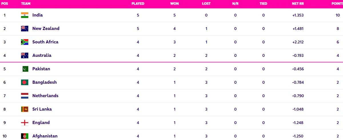 World Cup Points Table : भारत की मेजबानी में खेला जा रहा ICC World Cup 2023 धीरे-धीरे और भी रोमांचक होता जा रहा है। जहां एक तरफ सभी टीमें लीग मैचों में जीत हासिल कर सेमीफाइनल में अपनी जगह पक्का करना चाह रही है। वहीं दूसरी तरफ कुछ टीमें बस जीत की तलाश में जुटी हुई है। भारत ने अपने पांच मैचों में जीत हासिल कर प्वाइंट्स के टॉप पर अपनी जगह पक्की कर ली है। भारतीय टीम लगभग सेमीफाइनल की दहलीज पर खड़ी हुई है। भारत को सेमीफाइनल में अपनी जगह पक्की करने के लिए बस अगले 2 मुकाबले जीतने होंगे। आज हम आपको बताने जा रहे है कुछ समीकरण, जिससे आप अंदाजा लगा सकते है कि सेमीफाइनल में कौन सी टीम अपनी जगह बना पाएंगी।