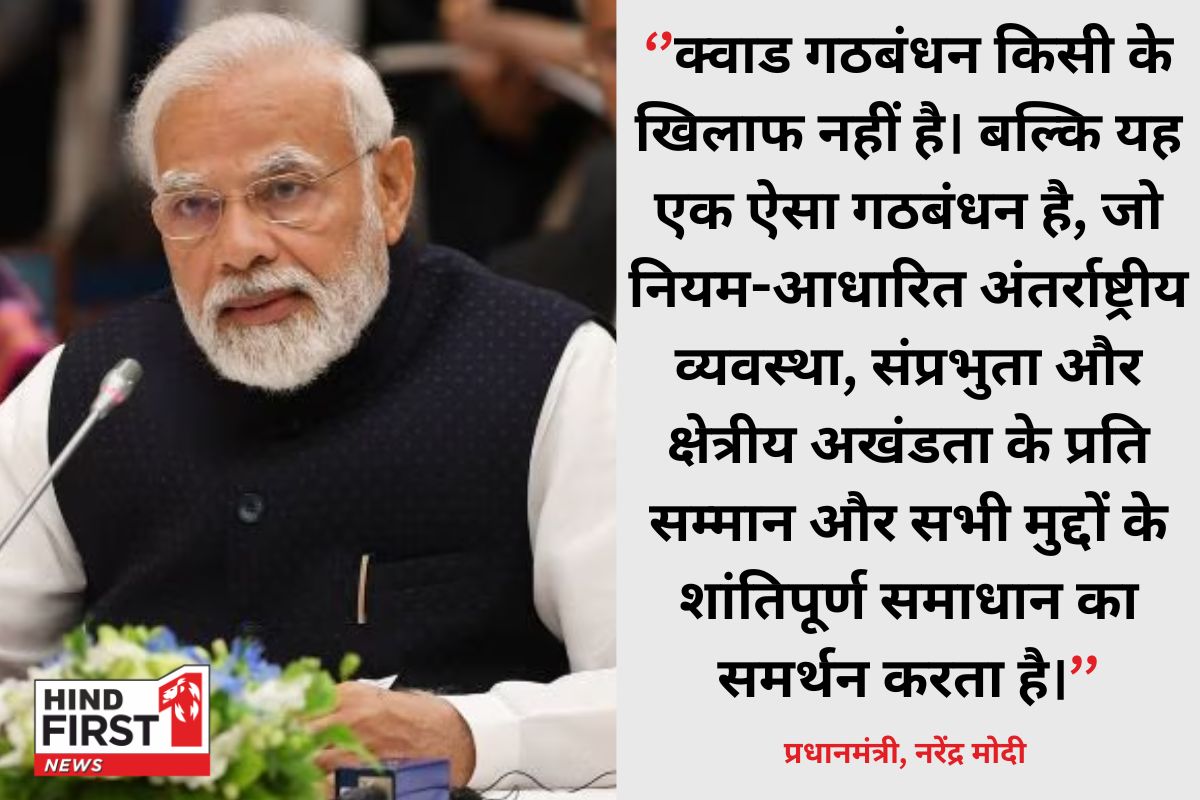 पीएम मोदी ने कहा,''क्वाड गठबंधन किसी के खिलाफ नहीं है। बल्कि यह एक ऐसा गठबंधन है, जो नियम-आधारित अंतर्राष्ट्रीय व्यवस्था, संप्रभुता और क्षेत्रीय अखंडता के प्रति सम्मान और सभी मुद्दों के शांतिपूर्ण समाधान का समर्थन करता है।''