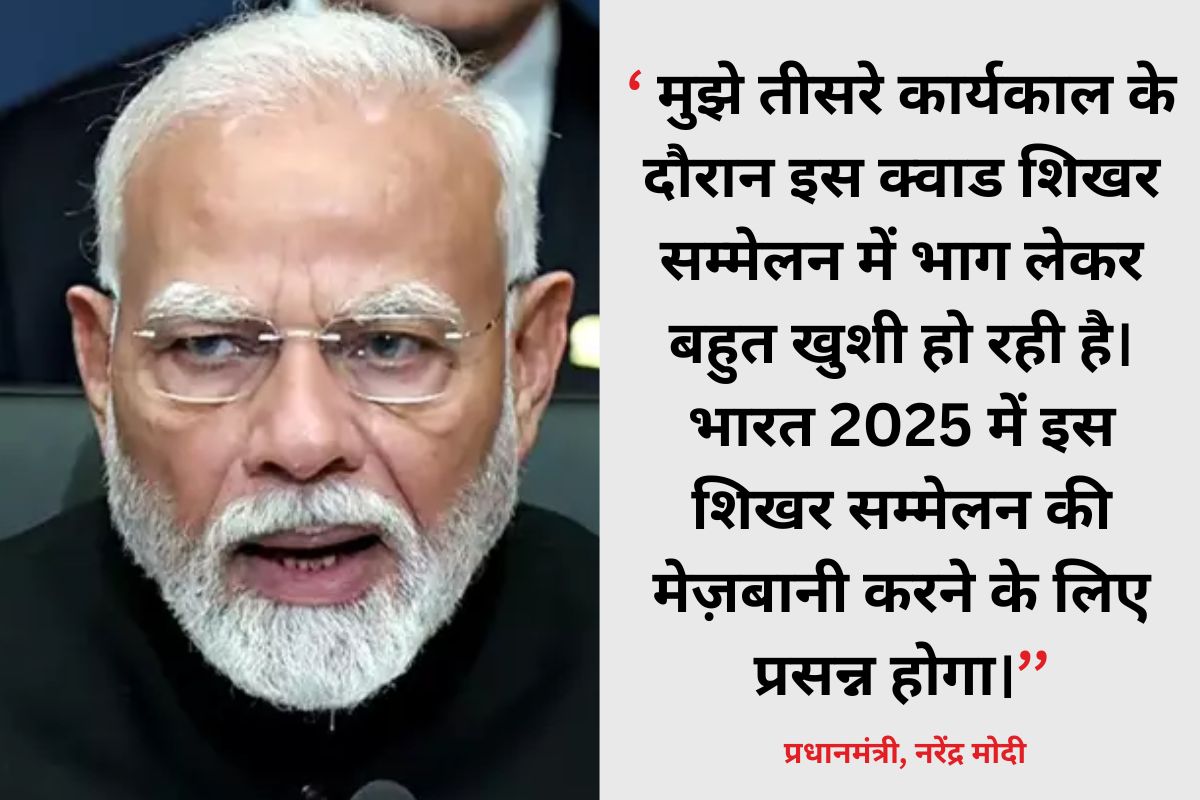 पीएम ने कहा, "मुझे तीसरे कार्यकाल के दौरान इस क्वाड शिखर सम्मेलन में भाग लेकर बहुत खुशी हो रही है। आपके नेतृत्व में 2021 का पहला शिखर सम्मेलन आयोजित हुआ था। उन्होंने कहा, "इतने कम समय में हमने हर दिशा में अभूतपूर्व तरीके से अपने सहयोग का विस्तार किया है। इसमें आपका बहुत महत्वपूर्ण योगदान रहा है। मैं क्वाड के प्रति आपकी प्रतिबद्धता और योगदान के लिए दिल से धन्यवाद करता हूं।" प्रधानमंत्री ने आगे कहा कहा कि भारत 2025 में इस शिखर सम्मेलन की मेज़बानी करने के लिए प्रसन्न होगा। पीएम मोदी अमेरिका के तीन दिवसीय यात्रा पर