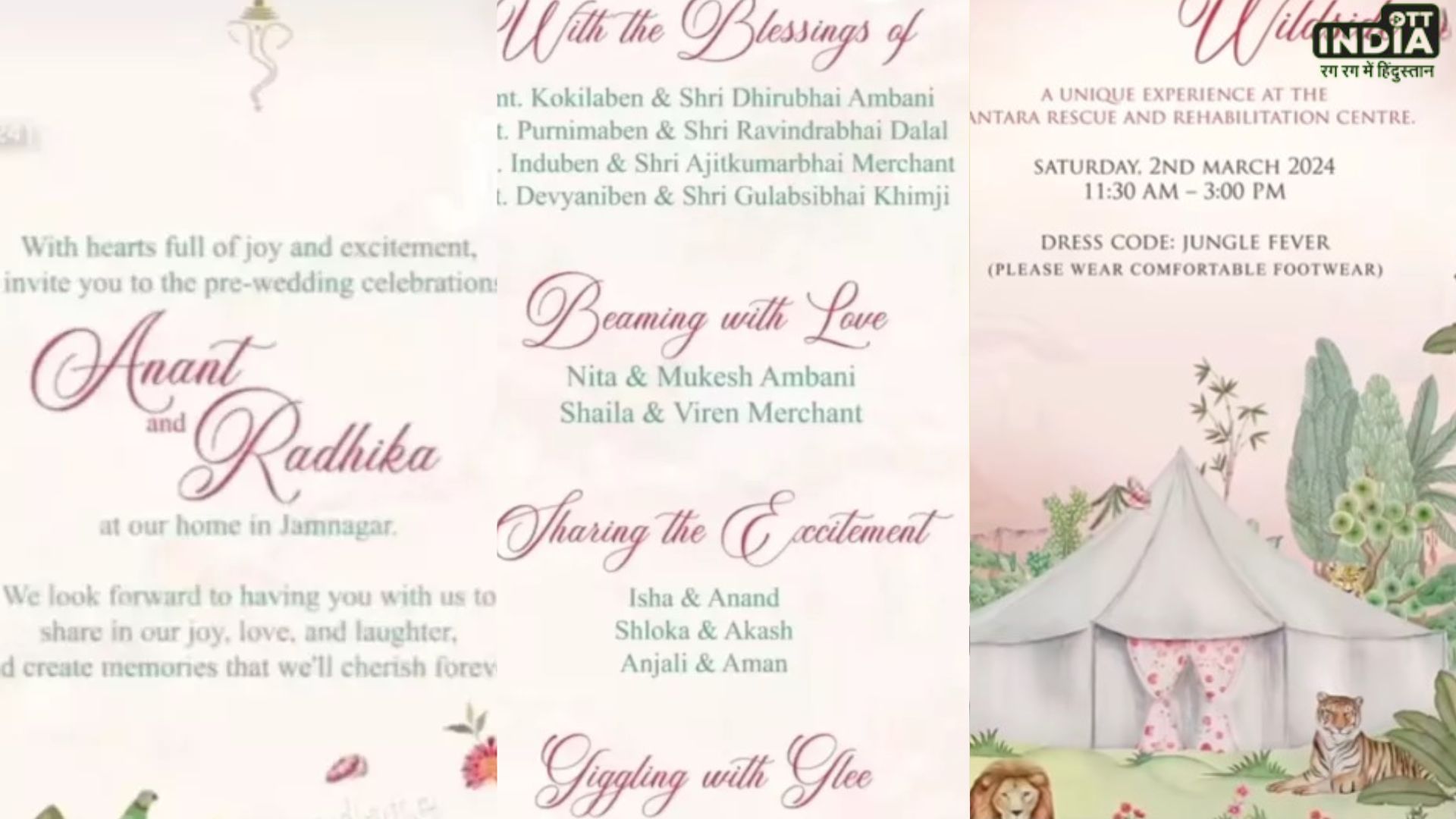 हाल ही में राधिका और अनंत अंबानी के प्री वेडिंग फंक्शन का खूबसूरत इनविटेशन कार्ड का वीडियो सामने आया था। वीडियो में 8 पेज लंबे इस इनविटेशन कार्ड में फंक्शन के वेन्यू से लेकर ड्रेस कोड और फंक्शन के समय का भी विस्तार से विवरण किया गया है। जिसके पहले पन्ने पर राधिका और अनंत का नाम लिखा गया है तो वहीं अन्य पन्नों पर प्यारा सा मैसेज और फंक्शन का विवरण किया गया है। प्री वेडिंग के फंक्शन को खास बनाने के लिए हर फंक्शन की अलग थीम और ड्रेस कोड रखा गया है।