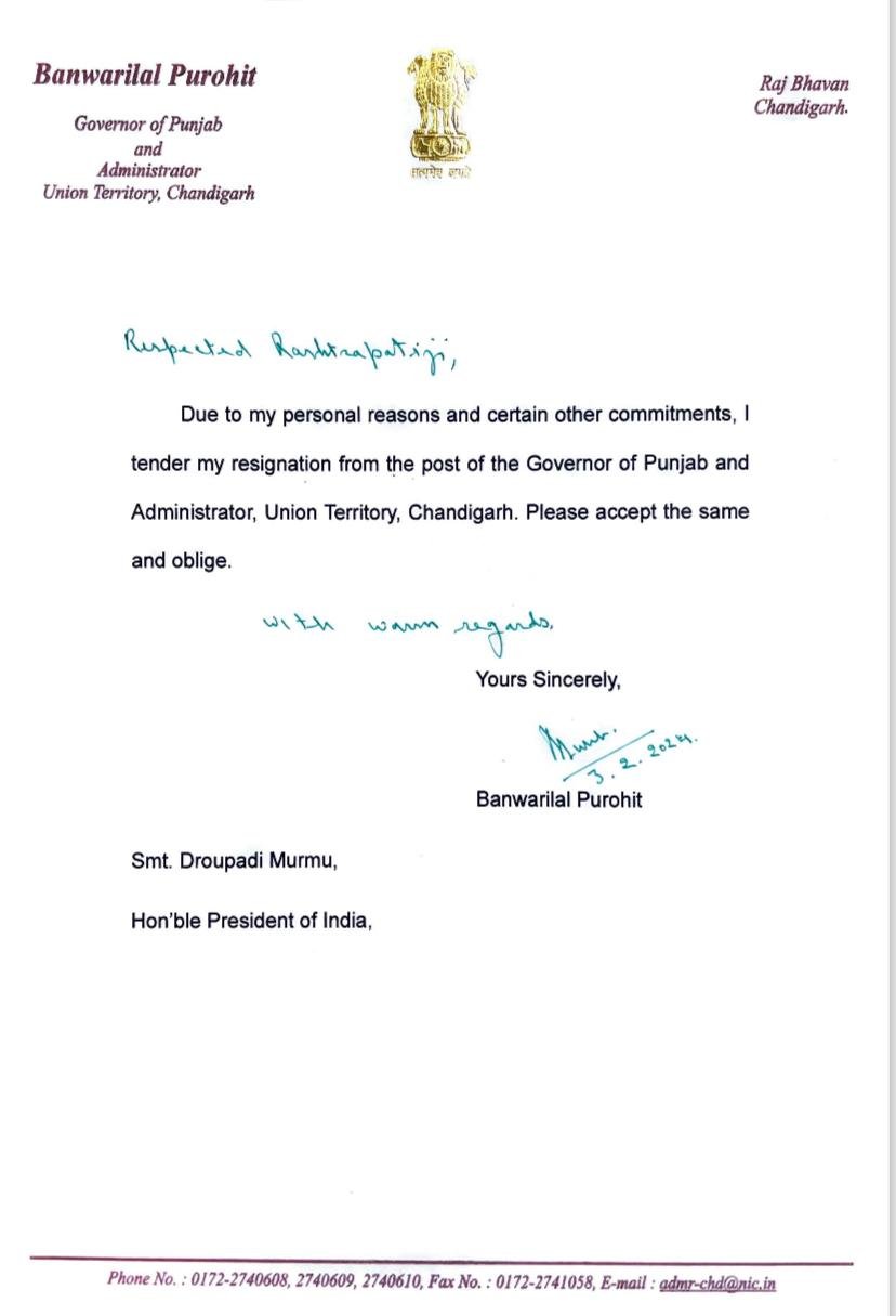 Punjab News: पंजाब के राज्यपाल बनवारी लाल पुरोहित ने पद से इस्तीफा दे दिया है। उन्होंने राष्ट्रपति द्रौपदी मुर्मू को अपना इस्तीफा सौंपा है। बनवारी लाल ने निजी कारणों से पद से इस्तीफा दिया है। राष्ट्रपति द्रौपदी मुर्मू को भेजे इस्तीफा पत्र में उन्होंने लिखा कि अपने व्यक्तिगत कारणों और कुछ अन्य प्रतिबद्धताओं के कारण मैं पंजाब (Punjab) के राज्यपाल और चंडीगढ़ प्रशासक के पद से अपना इस्तीफा देता हूं। कृपया इसे स्वीकार करें। यह भी पढ़े: सीएम अरविंद केजरीवाल के घर पहुंची क्राइम ब्रांच की टीम, विधायकों की खरीद-फरोख्त मामले में मांगे सबूत