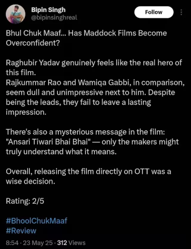 राजकुमार राव और वामिका गब्बी स्टारर फिल्म 'भूल चूक माफ' का एक्स रिव्यू सामने आ चुका है, जिसे दर्शकों का मिश्रित रिस्पॉन्स मिला है।