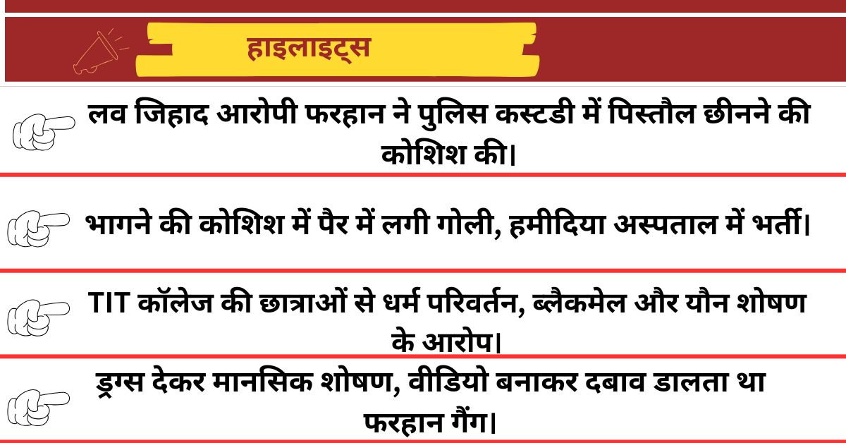 भोपाल में धर्मांतरण और यौन शोषण के आरोपी फरहान ने हिरासत में पिस्तौल छीनने की कोशिश की, मुठभेड़ में गोली लगी; 'लव जिहाद गैंग' का खुलासा।