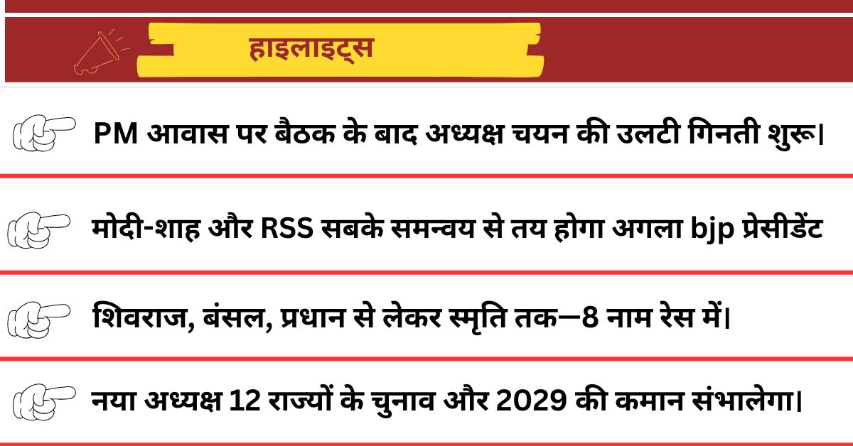 PM आवास पर बैठक के बाद BJP अध्यक्ष को लेकर सस्पेंस बढ़ा। आठ नाम, RSS की पसंद, 2029 की तैयारी—हफ्तेभर में नया चेहरा संभव।