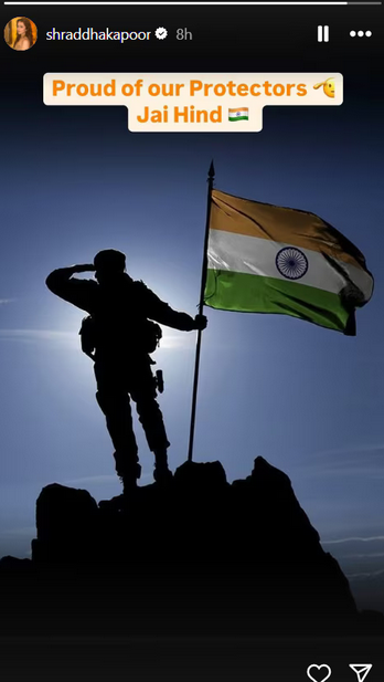 एक्ट्रेस श्रद्धा कपूर ने भारतीय सेना की तारीफ करते हुए अपने इंस्टाग्राम अकाउंट से एक स्टोरी पोस्ट की। फोटो में हम तिरंगा लिए एक सिपाही नजर आ रहा है, जिसे एक्ट्रेस सैल्यूट वाले इमोजी के साथ शेयर किया था। उन्होंने इसके साथ लिखा, "हमें अपने रक्षकों पर गर्व है। जय हिंद।"