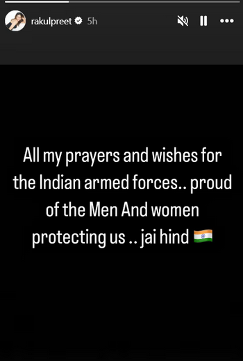 अभिनेत्री रकुल प्रीत ने भी भारतीय सेना की सराहना की। उन्होंने अपनी पोस्ट में लिखा, "इंडियन फोर्स के लिए प्रार्थनाएं और शुभकामनाएं... हमारी रक्षा करने वाले पुरुषों और महिलाओं पर गर्व है... जय हिंद।"