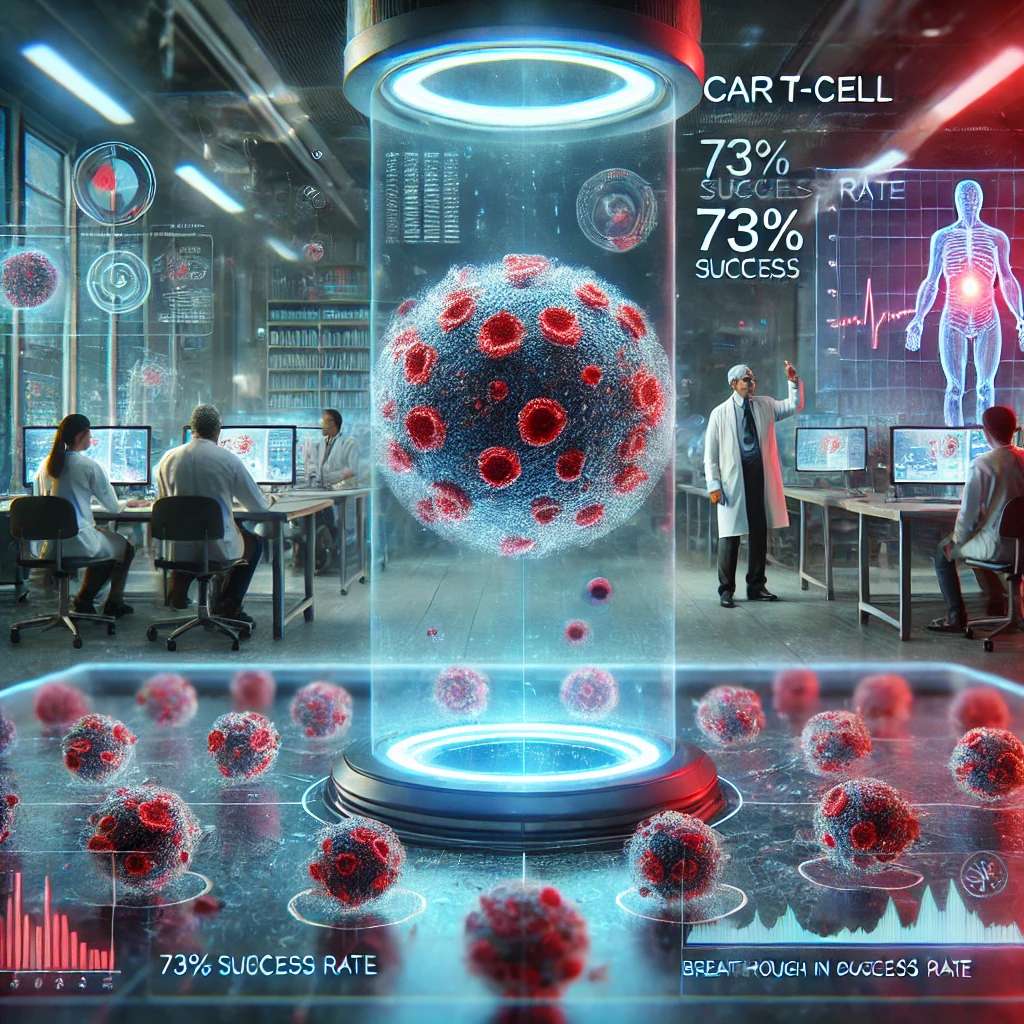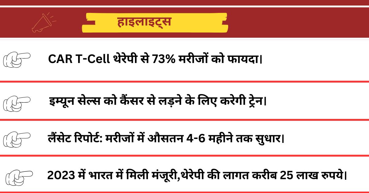 CAR T-Cell थेरेपी भारत में 73% कैंसर मरीजों पर कारगर रही, जो शरीर की प्रतिरक्षा प्रणाली को प्रशिक्षित कर कैंसर सेल्स नष्ट करती है।