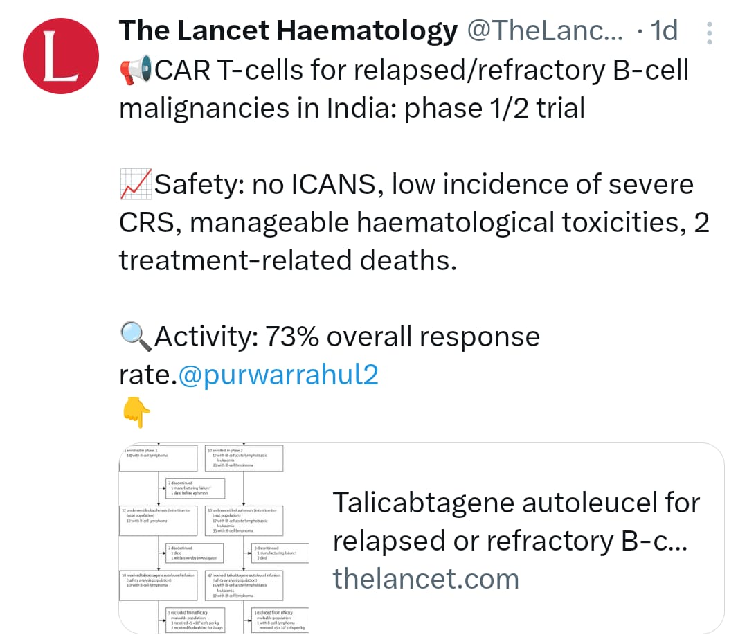 राष्ट्रीय स्वास्थ्य संस्थान (NIH) के अनुसार, साल 2022 में भारत में कैंसर के 14.61 लाख से अधिक नए मामले सामने आए। कैंसर के बढ़ते मामलों के साथ, उन्नत उपचार पद्धतियों की आवश्यकता भी बढ़ गई है। CAR T-Cell थेरेपी ऐसे मरीजों के लिए एक नई उम्मीद लेकर आई है, जिन पर अन्य उपचार विफल हो चुके हैं। भारत के औषधि नियामक (Drug Regulator) ने 2023 में इस थेरेपी को मंजूरी दी, और अब यह अपोलो, फोर्टिस, अमृता और मैक्स जैसे प्रमुख अस्पतालों में उपलब्ध है।थेरेपी का असर: लैंसेट रिपोर्ट की रिपोर्ट