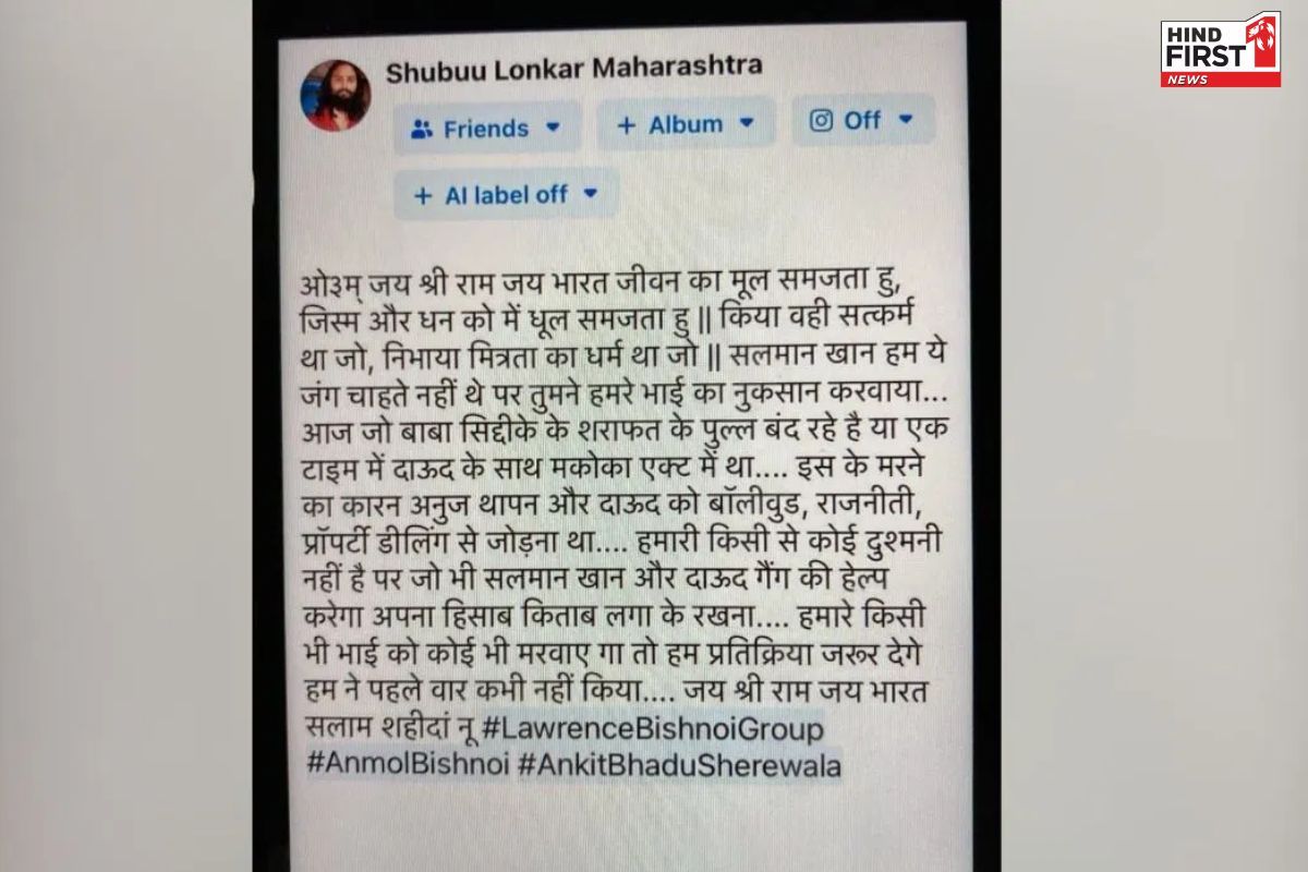 शुभु लोनकर ने फेसबुक पर लिखा, "सलमान खान, हमने यह जंग नहीं चाही थी, लेकिन तुमने हमारे भाई को नुकसान पहुँचाया।" उन्होंने आगे कहा कि आज बाबा सिद्दीकी की छवि को लेकर बातें की जा रही हैं, जबकि वह एक समय दाऊद के साथ मकोका एक्ट में थे।