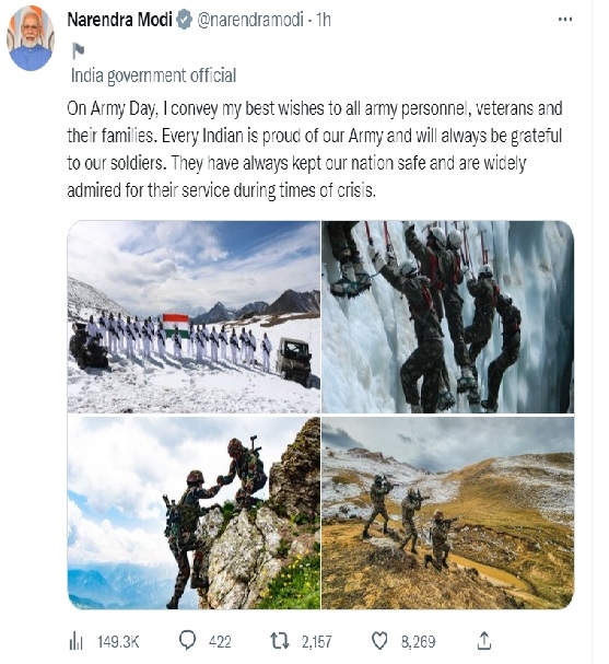 उन्होंने ट्वीट में कहा, “सेना दिवस पर, मैं सभी सैन्य कर्मियों, दिग्गजों और उनके परिवारों को अपनी शुभकामनाएं देता हूं। हर भारतीय को हमारी सेना पर गर्व है और हमेशा हमारे जवानों का आभारी रहेगा। उन्होंने हमेशा हमारे देश को सुरक्षित रखा है। और संकट के समय उसके द्वारा की गई देश की सेवा के लिए व्यापक रूप से उनकी प्रशंसा की जाती है। “