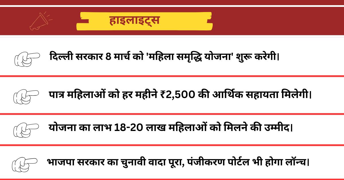 दिल्ली सरकार 8 मार्च को 'महिला समृद्धि योजना' शुरू करेगी, जिसमें 21-60 वर्ष की महिलाओं को हर महीने 2,500 रुपये की आर्थिक सहायता मिलेगी।