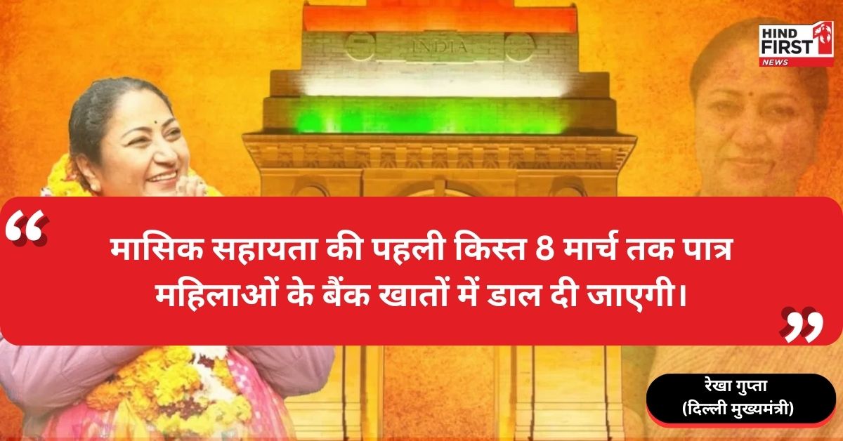 रेखा गुप्ता ने इस घोषणा को प्रधानमंत्री नरेंद्र मोदी के विज़न का हिस्सा बताते हुए कहा कि "दिल्ली में भाजपा सरकार अपने सभी वादों को पूरा करेगी। मुख्यमंत्री रेखा गुप्ता ने घोषणा की कि दिल्ली की महिलाओं के बैंक खातों में पहली किस्त 8 मार्च को ट्रांसफर कर दी जाएगी। यह तारीख अंतरराष्ट्रीय महिला दिवस के रूप में मनाई जाती है, जिससे यह कदम महिलाओं के लिए और भी खास बन गया है।सरकार ने कहा है कि यह योजना सभी पात्र महिलाओं के लिए लागू होगी और आगे भी इसे नियमित रूप से जारी रखा जाएगा।