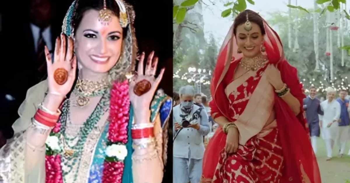 अपनी शादी के दिन दीया मिर्जा ने रितु कुमार द्वारा डिजाइन किया गया ग्रीन कलर का जरदोजी गरारा पहना था, जिसमें जटिल गोल्डन कढ़ाई के साथ बेज कलर की कमीज और हैवी डिटेलिंग थी। उन्होंने इसे ब्लू एंड गोल्डन कलर के बॉर्डर वाले ग्रीन कलर के दुपट्टे के साथ पहना था। लेयर्ड एमराल्ड एंड गोल्ड नेकलेस, एक स्टेटमेंट मांग टीका और मैचिंग इयररिंग्स उन्हें एलिगेंट लुक दे रहा था। बता दें कि जब उन्होंने 2021 में वैभव रेखी संग शादी की थी, तब उन्होंने रेड कलर की सिंपल साड़ी पहनी थी।