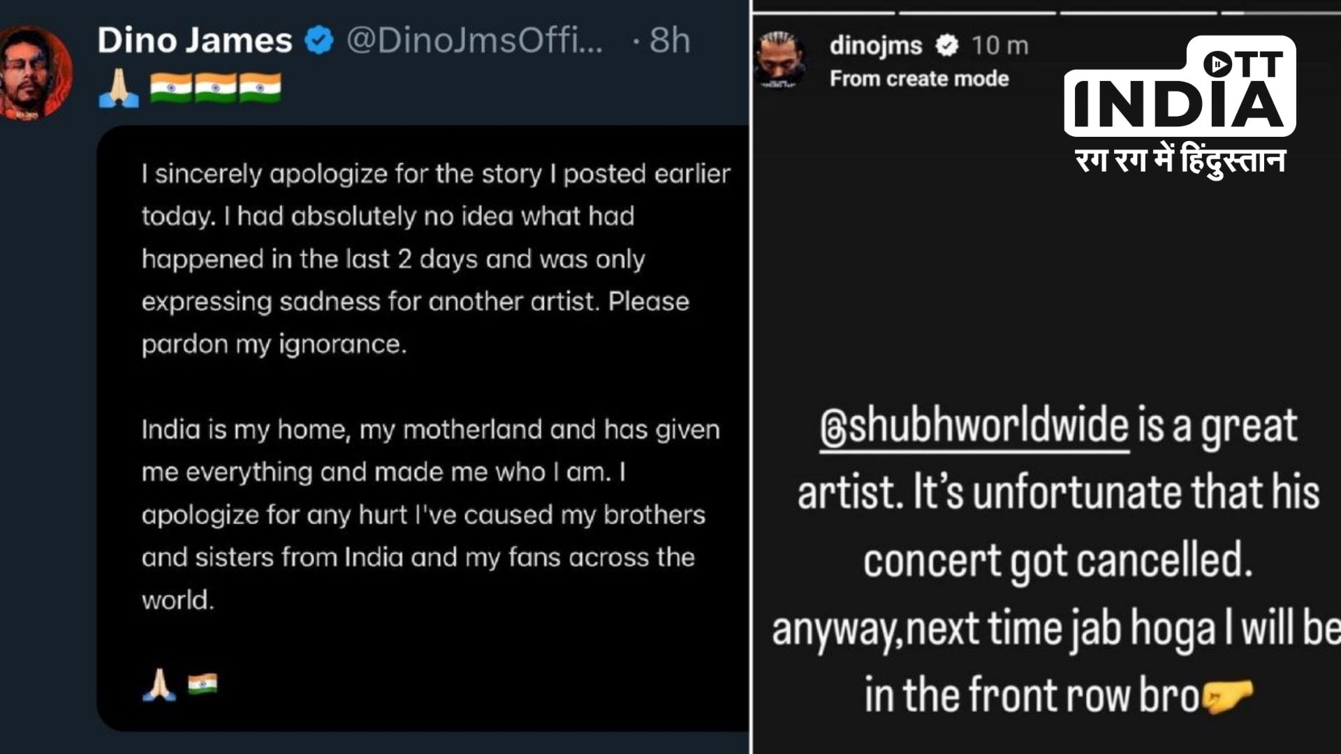 जैसे ही लोगो ने डिनो को ट्रोल करना शुरू किया वह समझ गए कि उन्होंने कुछ तो गलत कर दिया है। इसके बाद डिनो ने तुरंत ही एक स्टोरी और वीडियो पोस्ट किया। वीडियो में डिनो जेम्स ने कहा- ''सुबह जो मैंने पोस्ट किया, उसका मकसद सिर्फ आर्टिस्ट टू आर्टिस्ट था, इसके आगे पीछे क्या हुआ है और बीतों 2 दिनों क्या चला है, उसके बारे में मुझे कोई भनक नहीं थी। मैं इस मामले के लिए हाथ जोड़कर माफी मांगता हूं। मैं भारत विरोधी नहीं हूं और न ही मैं देश के विरोध में किसी को सपोर्ट करता हूं। भारत मेरी मातृभूमि है और इस देश से मुझे वो सब कुछ मिला है, जिसकी बदौलत मैं आज यहां हूं।''अब शुभ का क्या होगा..