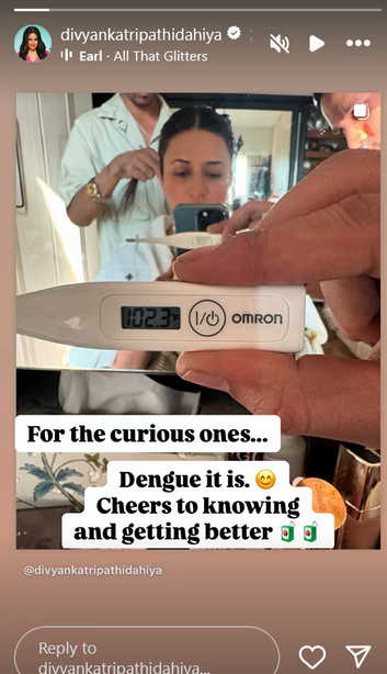 बता दें कि दिव्यांका त्रिपाठी एक एक्टिव सोशल मीडिया यूजर हैं, जो अपने फैंस के लिए पोस्ट्स शेयर करती रहती हैं। हाल ही में, उन्होंने अपनी स्टोरी पर एक पोस्ट शेयर की, जो उनके फैंस के लिए शॉकिंग हो सकती है। उनकी पोस्ट में एक थर्मामीटर देखा जा सकता है, जिस पर 102.3°F टेम्परेचर देखा जा सकता है। फोटो के बैकग्राउंड में दिव्यांका नजर आ रही हैं, जो शीशे के सामने बैठी दिख रही हैं। वो अपने हेयर सेट करवा रही हैं। फोटो पर उन्होंने लिखा- ''जो लोग जानना चाह रहे थे...डेंगू हो गया है। मैं ठीक हो रही हूं।'' जैसे ही दिव्यांका ने यह पोस्ट शेयर की, वैसे ही उनके फैंस उनके जल्दी ठीक होने के लिए प्रार्थना कर रहे हैं।