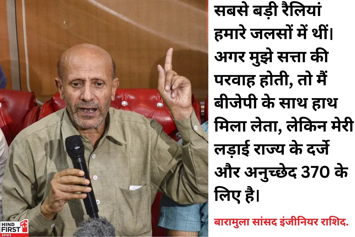 रशीद ने अपनी पार्टी की प्राथमिकताओं के बारे में खुलासा करते हुए कहा कि उनकी लड़ाई राज्य के दर्जे और अनुच्छेद 370 को लेकर है। उन्होंने यह भी कहा कि कांग्रेस पार्टी आज इस मुद्दे पर कुछ नहीं बोल रही, जबकि वे इस मुद्दे पर बात करने के लिए तैयार थे। रशीद ने यह भी कहा कि अगर कांग्रेस के नेता राहुल गांधी इस मुद्दे पर समर्थन दिखाते हैं, तो वह उनके साथ जाने के लिए तैयार हैं। रशीद ने यह साफ किया कि अगर उन्हें सत्ता की इच्छा होती, तो वह बीजेपी के साथ गठबंधन कर सकते थे, लेकिन उनकी प्राथमिकता राज्य के दर्जे की बहाली और अनुच्छेद 370 की पुनः बहाली है।ये भी पढ़ें- गुजरात के CM से भारत के PM तक: जानें पीएम मोदी ने 23 साल के सफर में कितने बड़े काम किए
