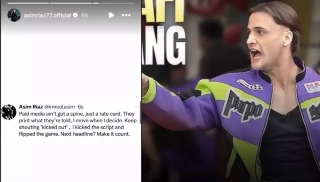 शो से बाहर निकाले जाने की खबर चलने के लगभग 48 घंटे बाद, आसिम रियाज़ ने इस पर प्रतिक्रिया दी। उन्होंने अपनी इंस्टाग्राम स्टोरीज पर एक मैसेज साझा किया। उन्होंने मीडिया पर हमला करते हुए दावा किया कि उनके पास कोई बैक नहीं है और वे वही रिपोर्ट कर रहे हैं, जो उन्हें बताया गया है। इसके अलावा, उन्होंने दावा किया कि उन्हें शो से बाहर नहीं निकाला गया था, बल्कि उन्होंने स्क्रिप्ट को लात मारी थी। उन्होंने लिखा, "पेड मीडिया में रीढ़ नहीं है, सिर्फ़ रेट कार्ड है। वे वही छापते हैं जो उन्हें बताया जाता है। मैं जब तय करता हूं, तब चलता हूं। 'बाहर निकाल दिया' चिल्लाते रहो। मैंने स्क्रिप्ट को लात मारी और खेल को पलट दिया। अगली सुर्खियां, इस पर ध्यान दें।"