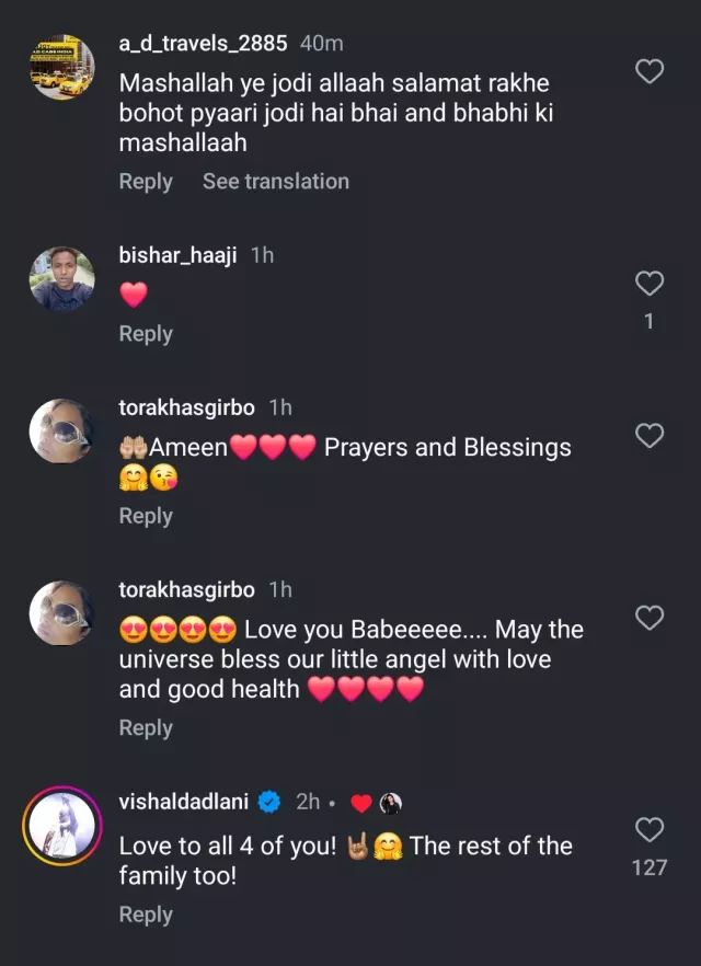 जैसे ही गौहर खान का वीडियो और पोस्ट सामने आया, वैसे ही उनके दोस्तों और फैंस ने उन्हें बधाई देनी शुरू कर दी। गौहर की दोस्त और अभिनेत्री अनीता हसनंदानी ने कमेंट सेक्शन में बधाई के साथ रेड हार्ट इमोजी शेयर किए। वहीं, गायक-संगीतकार विशाल ददलानी ने लिखा, "आप चारों को प्यार। परिवार के बाकी सदस्यों को भी।"