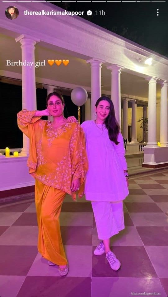 अगली फोटो में, करीना और करिश्मा ने बाहर पोज दिया और बैकग्राउंड में सजाया हुआ पटौदी पैलेस खड़ा था। उन्होंने लिखा, "Birthday girl 💛💛💛"