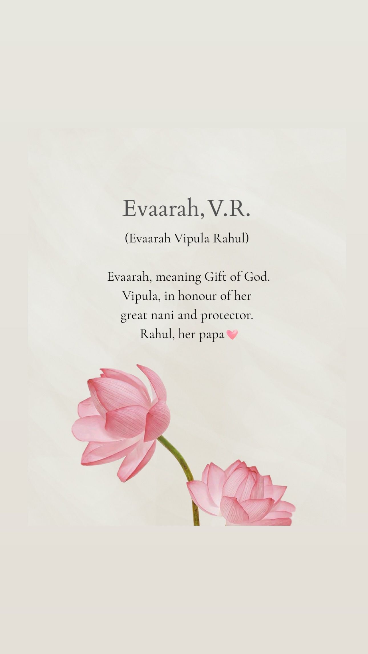 फोटो में अथिया सॉफ्ट बेज एंड ऑफ-व्हाइट फुल-स्लीव टॉप में अच्छी लग रही थीं, जो अपनी बेटी को प्यार से निहारती हुई नजर आईं। जबकि केएल राहुल हल्के रंग की टी-शर्ट पहने हुए थे और अपनी बेटी को गोद में लिए हुए थे। अथिया ने एक अलग पोस्ट में अपनी बेटी का पूरा नाम भी शेयर किया कि इवारा का पूरा नाम 'इवारा वी.आर' (इवारा विपुला राहुल) है, जिसमें उनके पिता का नाम भी शामिल है।