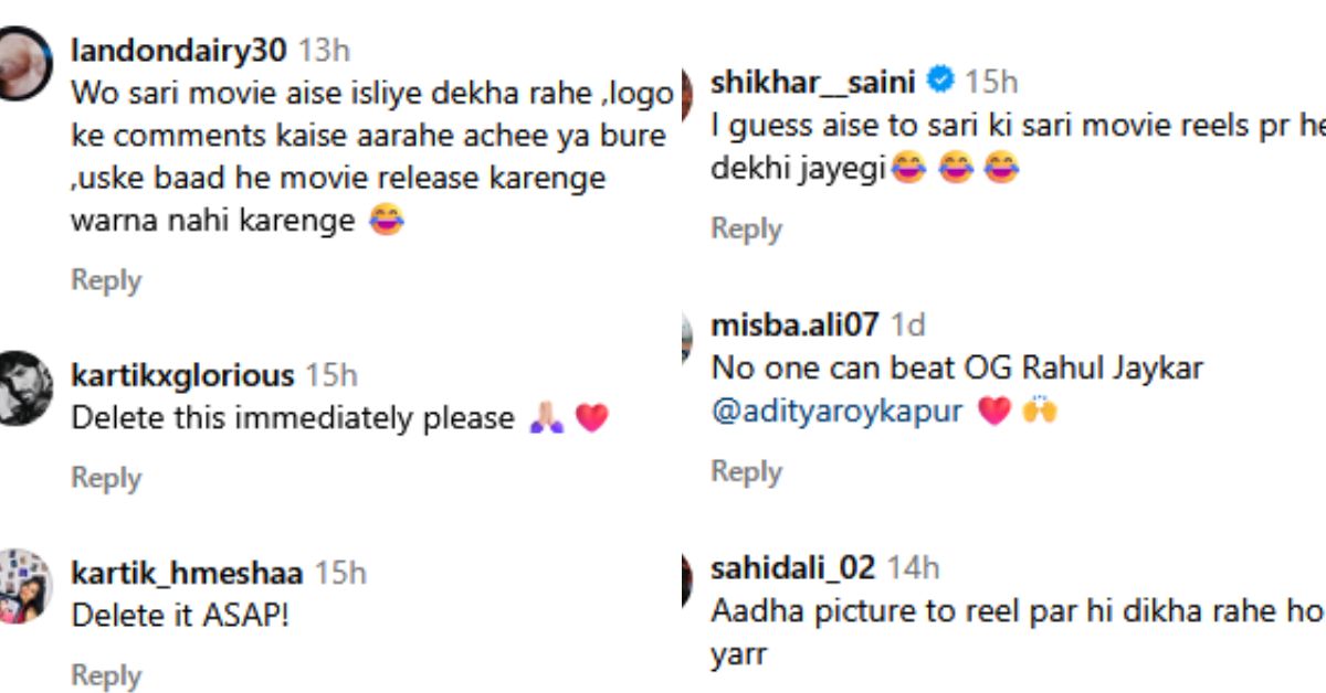 एक कमेंट में लिखा था, ''पूरी फिल्म रिलीज से पहले रील्स पर लीक हो गई है।'' एक अन्य ने लिखा था, ''रील्स पर रिव्यू कल आएगा।'' वहीं, एक अन्य ने कमेंट किया, "ये पहला ऐसा एक्टर है जिसकी फिल्म आने से पहले ही फ्लॉप हो जाएगी।" इसके अलावा, कुछ यूजर्स ने यह भी लिखा कि आधी फिल्म तो रील्स पर ही देख ली है।
