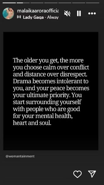 हाल ही में, मलाइका अरोड़ा ने अपने इंस्टाग्राम अकाउंट से एक स्टोरी शेयर की, जिसमें उन्होंने लिखा, "आप जितने मैच्योर होते हैं, उतना ही संघर्ष के बजाय शांति और अपमान की बजाय दूरी चुनते हैं। ड्रामा बर्दाश्त के बाहर होता है। आपकी शांति आपके लिए सबसे ज्यादा जरूरी हो जाती है। आप अपने आस पास ऐसे लोगों को रखना शुरू कर देते हैं जो आपकी मेंटल हेल्थ, दिल और आत्मा के लिए अच्छे हैं।"