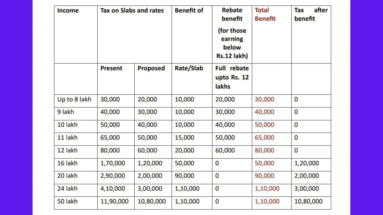 अगर आपकी इनकम 4 लाख रुपए तक है, तो आपको कोई टैक्स नहीं देना होगा। लेकिन जैसे ही आपकी आय 4 लाख रुपए से 1 रुपया भी ज्यादा हो जाती है, तो आप 5 प्रतिशत टैक्स वाले स्लैब में आ जाते हैं। इसका मतलब अगर आपकी इनकम 4 लाख से ऊपर हो जाती है, तो आपको 20,000 रुपए टैक्स के रूप में देना पड़ेगा। हालांकि टैक्स में रिबेट मिलने की वजह से आपको यह टैक्स नहीं देना पड़ेगा। अगर आपकी सालाना इनकम 8 लाख रुपए से अधिक हो जाती है, तो आप 10 प्रतिशत वाले टैक्स स्लैब में आ जाएंगे। इसका मतलब है कि आपकी 8 से 12 लाख रुपए तक की इनकम पर 10 प्रतिशत टैक्स लगेगा, जो होगा 40,000 रुपए। वहीं, 4 से 8 लाख रुपए तक की इनकम पर 20,000 रुपए टैक्स लगेगा। इस तरह से कुल टैक्स 60,000 रुपए होगा। लेकिन सरकार आपको इस पर कुछ छूट भी देगी।
