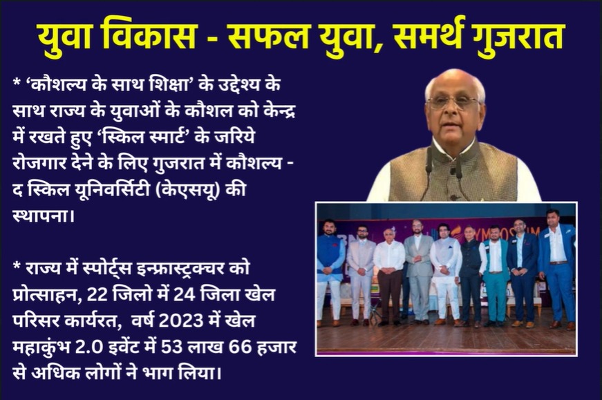 3 साल सुशासन की उपलब्धियां •गुजरात की जनता के लिए गरवुं (गौरवशाली) गुजरात, गुणवंतु (गुणी) गुजरात, ग्रीन गुजरात, ग्लोबल गुजरात तथा गतिशील गुजरात; इन 5जी को शामिल करते हुए सर्वग्राही दिशादर्शक 3 लाख 32 हजार करोड़ रुपए का बड़ा बजट दिया। •वाइब्रेंट गुजरात ग्लोबल समिट 2024 के 10वें संस्करण का सफल आयोजन किया गया। •“अर्निंग वेल, लिविंग वेल” के मंत्र के साथ ‘विकसित गुजरात@2047’ का रोडमैप बनाने वाला गुजरात देश का प्रथम राज्य। •जीरो कैजुअल्टी दृष्टिकोण के साथ बिपरजॉय चक्रवात का सामना किया, जान-माल के बड़े नुकसान को टाला जा सका। •भारत ने वर्ष 2023 में पहली बार जी20 की अध्यक्षता की, जिसके तहत गुजरात में 17 जी20 बैठकों का सफलतापूर्वक आयोजन किया गया। इसके जरिये गुजरात की संस्कृति एवं समृद्धि को अंतरराष्ट्रीय स्तर पर उजागर किया गया। •गुजरात में 2475 अमृत सरोवरों के निर्माण लक्ष्य के समक्ष 2649 अमृत सरोवरों का निर्माण कार्य पूर्ण किया गया, जो लक्ष्य का 107 प्रतिशत है। •मुख्यमंत्री कार्यालय को ISO 9001:2015 सर्टिफिकेशन प्राप्त हुआ। •मुख्यमंत्री के सार्वजनिक कार्यक्रमों से लेकर विकास के विभिन्न कार्यों के बारे में लोगों तक पूरी जानकारी पहुँचाने के लिए मुख्यमंत्री कार्यालय द्वारा अपना अधिकृत व्हॉट्सएप चैनल शुरू किया गया। •नीति आयोग द्वारा घोषित किए गए सतत विकास लक्ष्यों (एसडीजी) इंडिया इंडेक्स में बेहतर स्वास्थ्य और खुशहाली क्षेत्र में गुजरात लगातार दूसरी बार देश में पहले स्थान पर रहा है। G-गरीबों, वंचितों, आदिवासियों और श्रमिकों का विकास • आगामी तीन वर्षों में 1500 करोड़ रुपए की लागत से लगभग 3 लाख निर्माण श्रमिकों के लिए सुविधायुक्त अस्थायी आवासों यानी श्रमिक बसेरों के निर्माण का आयोजन। • ई-श्रम पोर्टल पर 1 करोड़ 17 लाख से अधिक असंगठित श्रमयोगियों का पंजीकरण कर उन्हें स्मार्ट जारी किए गए। • 1 लाख करोड़ रुपए की वनबंधु कल्याण योजना 2.0 लागू की गई। • श्रमिक अन्नपूर्णा योजना के अंतर्गत राज्य के 19 जिलों में 290 खाद्य वितरण केन्द्र कार्यरत किए गए हैं और इस योजना के तहत अब तक 2 करोड़ 68 लाख लोगों को भोजन का वितरण किया गया है। • प्रधानमंत्री आवास योजना के अंतर्गत गुजरात में 14 लाख से अधिक आवासों का निर्माण कार्य। • 72 लाख से अधिक एनएफएसए कार्डधारक परिवारों को मुफ्त अनाज वितरण होता है, राज्य के 3.82 करोड़ लोगों को अब प्रधानमंत्री गरीब कल्याण अन्न योजना में शामिल कर लिया जाएगा। युवा विकास - सफल युवा, समर्थ गुजरात • भारत सरकार के डिपार्टमेंट फॉर प्रमोशन ऑफ इंडस्ट्री एंड इंटरनल ट्रेड द्वारा जारी स्टार्टअप रैंकिंग के अनुसार गुजरात पिछले चार वर्षों से लगातार देश में सर्वश्रेष्ठ प्रदर्शन करने वाले राज्य के रूप में पहले स्थान पर। • ‘कौशल
