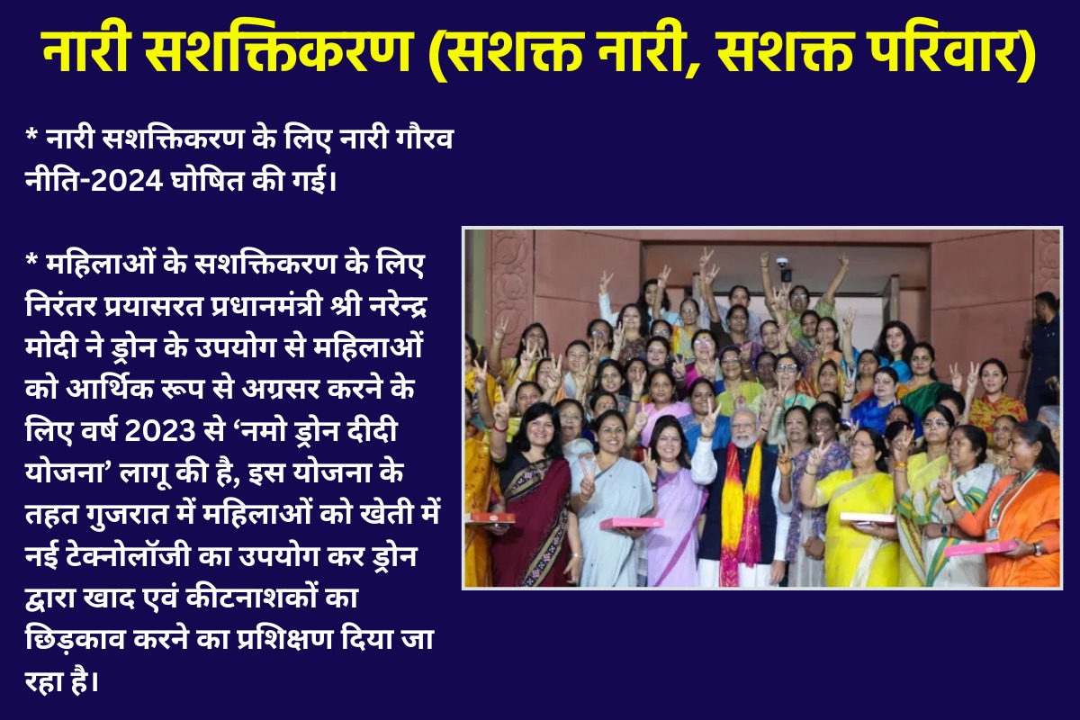 अन्नदाता का मान, अन्नदाता का ध्यान • प्रधानमंत्री किसान सम्मान निधि योजना के अंतर्गत लगभग 58.79 लाख किसान परिवारों को 11,058.59 रुपए की राशि सीधे लाभार्थियों के बैंक खाते में। • राज्य का डांग जिला पहला 100 प्रतिशत प्राकृतिक खेती करने वाला जिला बना, अब तक राज्य के 53 लाख से अधिक किसानों ने प्राकृतिक खेती का प्रशिक्षण लिया है, जिनमें से 9.85 लाख किसान 8.45 लाख एकड़ से अधिक भूमि पर सक्रिय रूप से प्राकृतिक खेती कर रहे हैं। • नैनो यूरिया की व्यापकता बढ़ी, लगभग 56.65 नैनो यूरिया (500 मि. ली.) बोतलों की खपत हुई। • कृषि क्षेत्र में उद्यमिता को बढ़ावा देने तथा कृषि क्षेत्र से सम्बद्ध जानकारी सेंट्रल पोर्टल पर उपलब्ध कराने के लिए इंडेक्स्ट-ए की स्थापना की गई। • लगभग 15 लाख किसानों ने सूक्ष्म सिंचाई पद्धति को अपनाया, जिसके अंतर्गत 23.4 लाख हेक्टेयर क्षेत्र कवर किया गया। • पिछले तीन वर्षों में किसानों को 24,660 करोड़ रुपए की बिजली सब्सिडी दी गई। • किसान सूर्योदय योजना के अंतर्गत राज्य के 13,730 यानी 76 फीसदी गांवों में किसानों को दिन के दौरान बिजली की आपूर्ति, किसानों की जीवन की गुणवत्ता में सुधार। • राज्य की 246 तहसीलों में रबी कृषि महोत्सव 2023 का सफल आयोजन, जिसमें 2.10 लाख से अधिक किसानों ने कृषि यूनिवर्सिटी के कृषि वैज्ञानिकों और विशेषज्ञों से तकनीकी मार्गदर्शन प्राप्त किया। • अरहर की 7000 रुपए प्रति क्विंटल, चने की 5440 रुपए प्रति क्विंटल तथा रायडा की 5650 रुपए प्रति क्विंटल समर्थन मूल्य पर खरीद की गई। वर्ष 2021-22 के दौरान चना उत्पादन बढ़ने से भारत सरकार द्वारा खरीदारी के लिए मंजूर मात्रा के अलावा राज्य सरकार के खर्च से अतिरिक्त 22 हजार मैट्रिक टन चने की 115 करोड़ रुपए से अधिक के खर्च से खरीद की गई। • ई-सेवाओं को अधिक सुलभ बनाने के लिए सामान्य सेवा केन्द्रों (सीएससी) के रूप में प्राथमिक कृषि ऋण समितियों (पीएसीएस) का विकास करने के लिए GOI की पहल के तहत 3233 पीएसीएस ऑनबोर्ड हुए हैं, जिनमें से 1812 पीएसीएस कार्यरत हैं। • विभिन्न कृषि राहत पैकेज अंतर्गत लगभग 12,78,600 प्रभावित किसान लाभार्थियों को 1925.89 करोड़ रुपए की सहायता का भुगतान किया गया है। • गुजरात में जुलाई-2024 में हुई भारी वर्षा से प्रभावित क्षेत्रों के किसानों के लिए 350 करोड़ रुपए का कृषि राहत-सहायता पैकेज घोषित किया गया है। • पिछले तीन वर्षो में पशुपालन क्षेत्र के लिए बजट प्रावधानों में कुल 132 प्रतिशत की वृद्धि की गई • "मुख्यमंत्री गौ-माता पोषण योजना” के तहत 609 करोड़ रुपए की सहायता चुकाई गई। • “लम्पी स्किन डिजीज” महामारी के दौरान 63 लाख स्वस्थ पशुओं का टीकाकरण किया गया। • मिलेट वर्ष का लाभ राज्य के लगभग 80 लाख लोगों व किसानों को हुआ। नारी सशक्तिकरण (सशक्त नारी, सशक्त परिवार) • महिला गर्भ धारण करने के बाद प्र