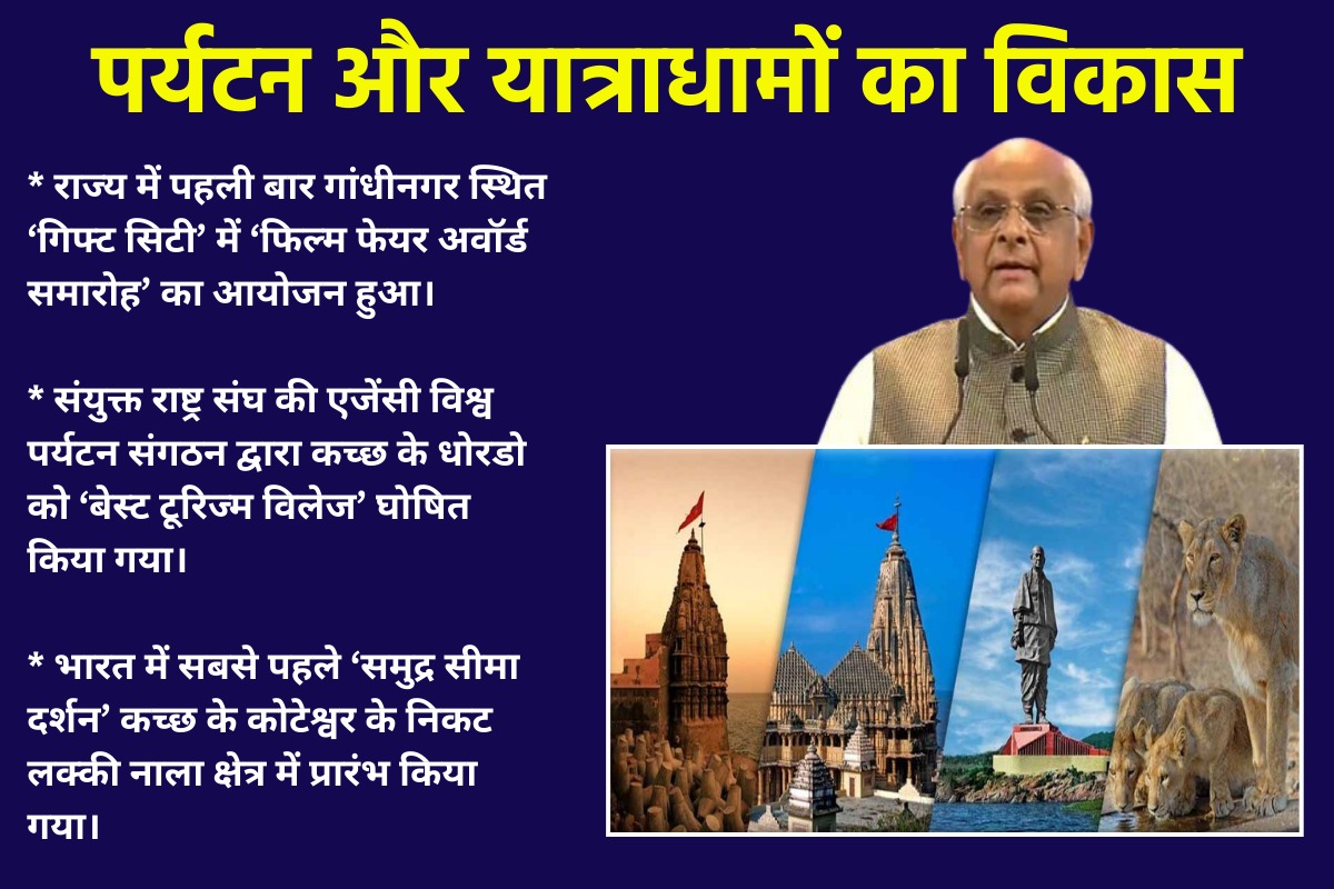 पर्यटन और यात्राधामों का विकास • राज्य में पहली बार गांधीनगर स्थित ‘गिफ्ट सिटी’ में ‘फिल्म फेयर अवॉर्ड समारोह’ का आयोजन हुआ। • संयुक्त राष्ट्र संघ की एजेंसी विश्व पर्यटन संगठन द्वारा कच्छ के धोरडो को ‘बेस्ट टूरिज्म विलेज’ घोषित किया गया। • भारत में सबसे पहले ‘समुद्र सीमा दर्शन’ कच्छ के कोटेश्वर के निकट लक्की नाला क्षेत्र में प्रारंभ किया गया। • यूनेस्को द्वारा प्रतिवर्ष घोषित किए जाने वाले आर्किटेक्चर और डिजाइन क्षेत्र के प्रतिष्ठित ‘प्रिक्स वर्सेल्स अवॉर्ड’ के अंतर्गत भुज के स्मृति वन भूकंप स्मारक संग्रहालय को दुनिया के सात सबसे सुंदर संग्रहालयों की सूची में स्थान मिला। • यूनेस्को द्वारा गुजरात के गौरव और सांस्कृतिक विरासत गरबा नृत्य को ‘अमूर्त सांस्कृतिक धरोहर’ घोषित किया गया। • भगवान श्री कृष्ण की नगरी ‘बेट द्वारका’ का विश्वस्तरीय कायापलट किया जाएगा। बेट द्वारका का तीन चरणों में सुव्यवस्थित विकास किया जाएगा। पहले चरण के लिए 150 करोड़ रुपए का आवंटन किया गया है। मुख्य मंदिर से लेकर बीच (समुद्र तट) तक के क्षेत्र को करोड़ों रुपए के खर्च से विकसित किया जाएगा। डॉल्फिन के लिए प्रसिद्ध एकमात्र बेट द्वारका का ‘नॉर्थ-पदम बीच’ सैलानियों के लिए आकर्षण का केंद्र बनेगा। • पावागढ में महाकाली माता के नवनिर्मित मंदिर के शिखर पर 500 वर्षों के बाद ध्वजारोहण किया गया। • मुख्य यात्राधामों के आसपास स्थित छोटे-छोटे यात्राधामों का 857.14 करोड़ रुपए के खर्च से शानदार विकास शुरू किया गया। • बहुचराजी माताजी के मंदिर के पुनर्निर्माण के पहले फेज के कार्य के अंतर्गत 76.51 करोड़ रुपए के खर्च से मंदिर का पुनर्निर्माण कर शिखर की ऊंचाई 86 फुट 1 इंच तक बढ़ाई जाएगी। • भारत सरकार द्वारा ‘एक भारत, श्रेष्ठ भारत’ के अंतर्गत सोमनाथ में सौराष्ट्र-तमिल संगमम कार्यक्रम का आयोजन किया गया। • साबरमती गांधी आश्रम का 1200 करोड़ रुपए के खर्च से पुनर्विकास किया जाएगा। विश्वस्तरीय सुविधाओं से सुसज्जित होगा स्मारक। जलसमृद्ध गुजरात • वलसाड जिले के पहाड़ी क्षेत्रों के अंदरूनी आदिवासी इलाकों में स्थित 174 गांवों और 1028 बस्तियों में रहने वाले 4.50 लाख लोगों को पानी उपलब्ध कराने के लिए इंजीनियरिंग की दृष्टि से चमत्कारिक एस्टोल प्रोजेक्ट का लोकार्पण किया गया। • सुजलाम सुफलाम जल अभियान के सातवें चरण में हमारी जल संग्रहण क्षमता में 11,523 लाख घन फुट की वृद्धि हुई है। • राज्य में ‘कैच द रेन’ के विचार के साथ जल संचय जन भागीदारी अभियान शुरू हुआ। • ‘जल जीवन मिशन’ के अंतर्गत नल से जल योजना के तहत पिछले तीन वर्षों में गुजरात राज्य के ग्रामीण क्षेत्रों में पेयजल उपलब्ध कराने के लिए 14 लाख नल कनेक्शन दिए गए हैं। • सौराष्ट्र और कच्छ जिल