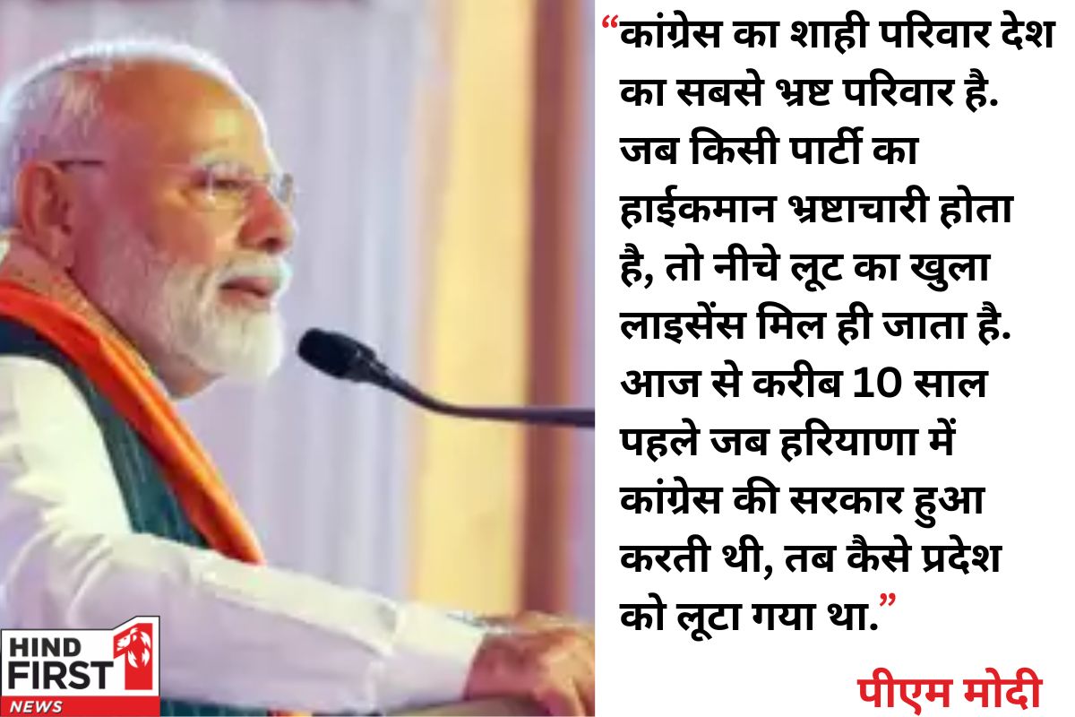 मोदी ने कांग्रेस के "शाही परिवार" को देश का सबसे भ्रष्ट परिवार बताया। उन्होंने कहा, “जब किसी पार्टी का हाईकमान भ्रष्ट होता है, तो नीचे लूट का खुला लाइसेंस मिल जाता है। आज से करीब 10 साल पहले जब हरियाणा में कांग्रेस की सरकार थी, तब प्रदेश को कैसे लूटा गया था, यह आप सभी जानते हैं। यहां किसानों की जमीनों को लूटा गया और प्रदेश को दलालों और दामादों के हवाले कर दिया गया।"