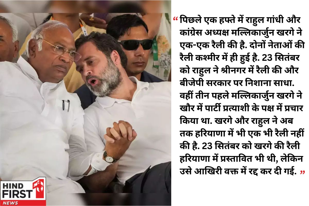 कांग्रेस के नेता राहुल गांधी और पार्टी अध्यक्ष मल्लिकार्जुन खरगे चुनावी कैंपेन में सुस्त नजर आ रहे हैं। दोनों नेताओं ने कश्मीर में केवल एक-एक रैली की है, जबकि हरियाणा में उनकी कोई रैली नहीं हुई।