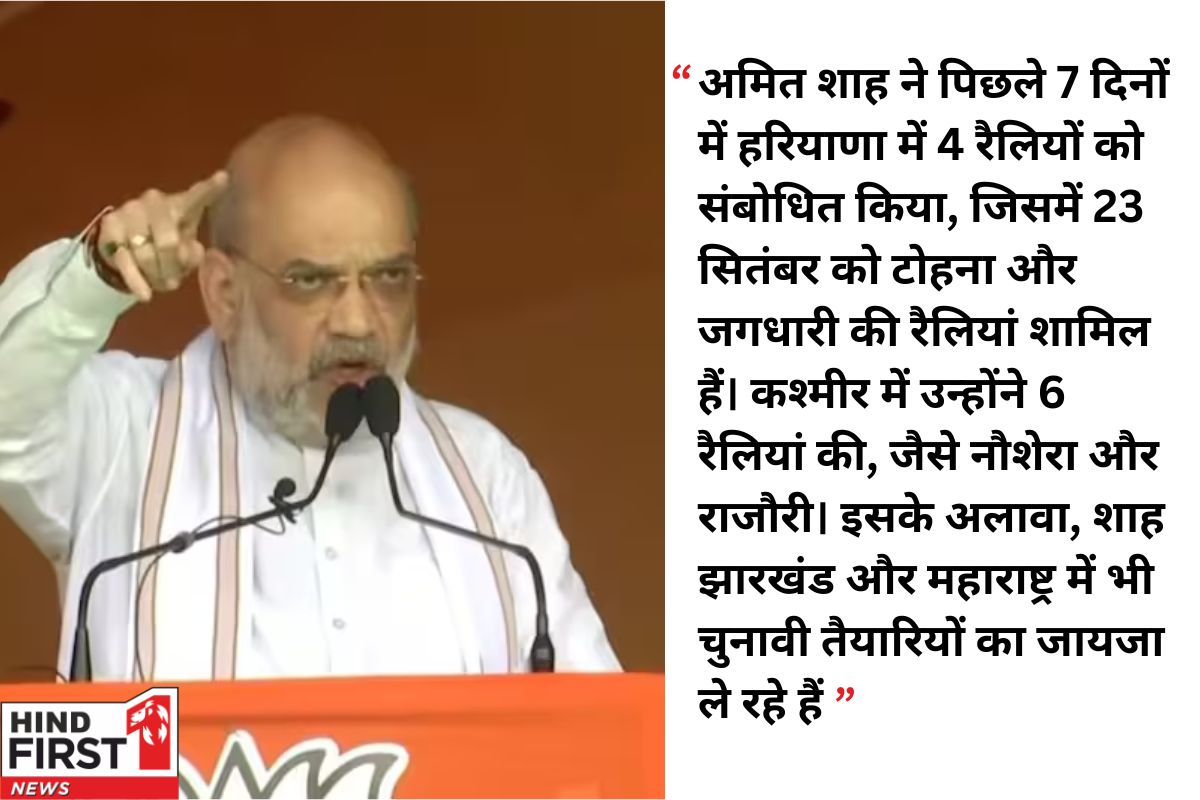 बीजेपी के लिए प्रधानमंत्री नरेंद्र मोदी और गृहमंत्री अमित शाह ने हाल ही में जम्मू-कश्मीर और हरियाणा में मिलकर 10 से ज्यादा रैलियां की हैं। मोदी ने कुरुक्षेत्र में रैली की, जबकि कश्मीर के डोडा और श्रीनगर में भी उन्होंने सभा की। अमित शाह ने पिछले 7 दिनों में हरियाणा में 4 रैलियों को संबोधित किया, जिसमें 23 सितंबर को टोहना और जगधारी की रैलियां शामिल हैं। कश्मीर में उन्होंने 6 रैलियां की, जैसे नौशेरा और राजौरी। इसके अलावा, शाह झारखंड और महाराष्ट्र में भी चुनावी तैयारियों का जायजा ले रहे हैं, क्योंकि इन राज्यों में साल के अंत में विधानसभा चुनाव होने हैं।