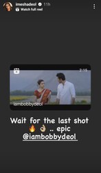 गुरुवार की रात, Esha ने अपनी Instagram story पर संदीप रेड्डी वांगा निर्देशित फिल्म का टीज़र share किया। उन्होंने टीज़र के अंत में अपने भाई Bobby Deol के लुक की सराहना की और लिखा, “Wait for the last shot…(fire emoji)…epic @iambobbydeol”.