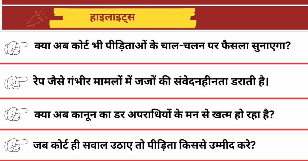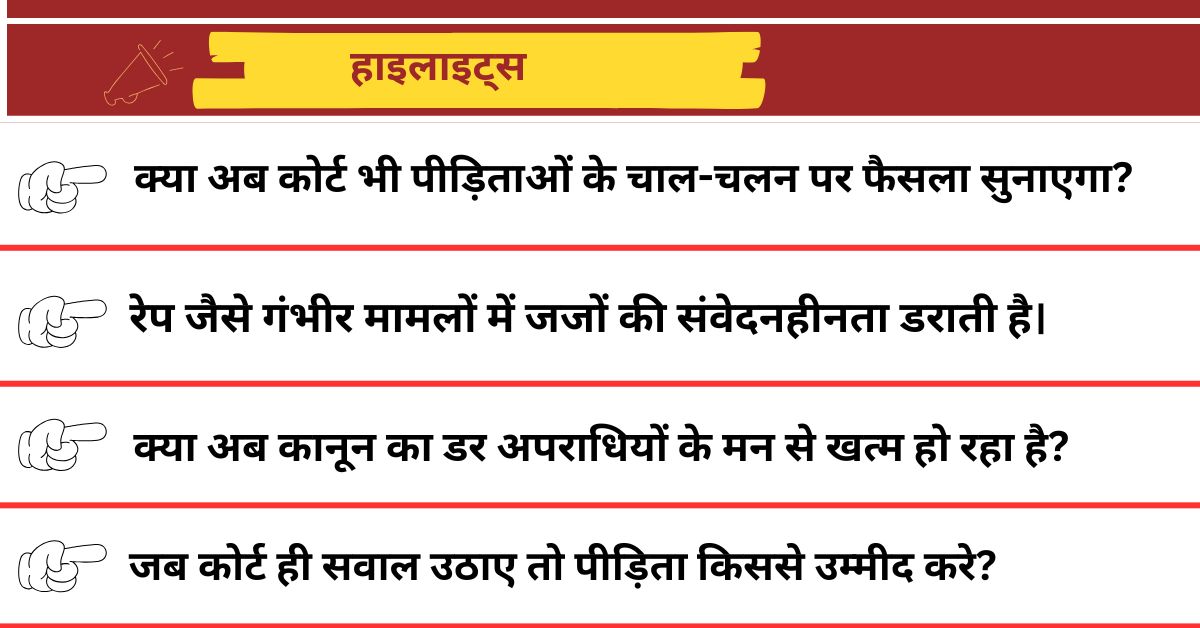 बता दें कि पुलिस थानों में शिकायत दर्ज कराने से लेकर मेडिकल टेस्ट तक, पीड़िता पहले ही कई मुश्किलों से गुजरती है। ऊपर से कोर्ट में ऐसी टिप्पणियाँ उसे और तोड़ सकती हैं। पहले पुलिस के सवाल, फिर मेडिकल की प्रक्रिया और अब कोर्ट का रवैया—क्या कोई पीड़िता इन सबके बाद हिम्मत जुटा पाएगी कि वह इंसाफ माँगने जाए?