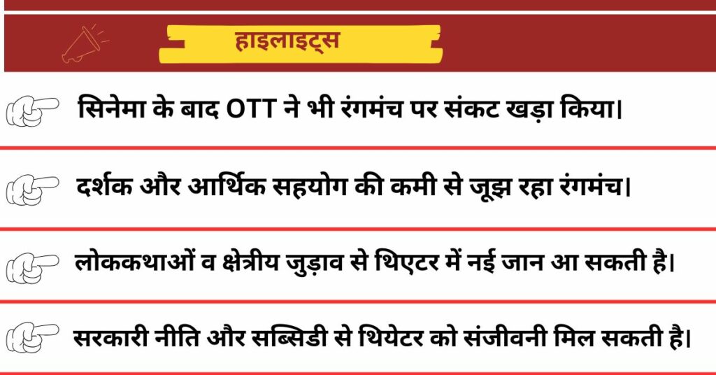 सिनेमा और OTT ने आधुनिक जीवन पर कब्ज़ा कर लिया है। महानगरीय चमक और राजनीतिक बहसों में लोक संस्कृति पीछे छूट गई है। विशेषज्ञ मानते हैं कि रंगमंच को फिर से प्रासंगिक बनाने के लिए इसे लोक जीवन से जोड़ना होगा। नौटंकी और रामलीला जैसे नाटकों में कभी भीड़ जुटती थी, क्योंकि वे आम लोगों की कहानियाँ कहते थे। आज एनएसडी जैसे संस्थान परंपरा और आधुनिकता का संतुलन बनाते हैं, लेकिन यह कोशिश राज्य स्तर तक नहीं पहुँच पाई। थियेटर को विविधता चाहिए—लोक कथाओं, गीतों और स्थानीय मुद्दों से जुड़कर ही यह नई साँस ले सकता है।थिएटर पॉलिसी से बच सकता है रंगमंच का भविष्य?