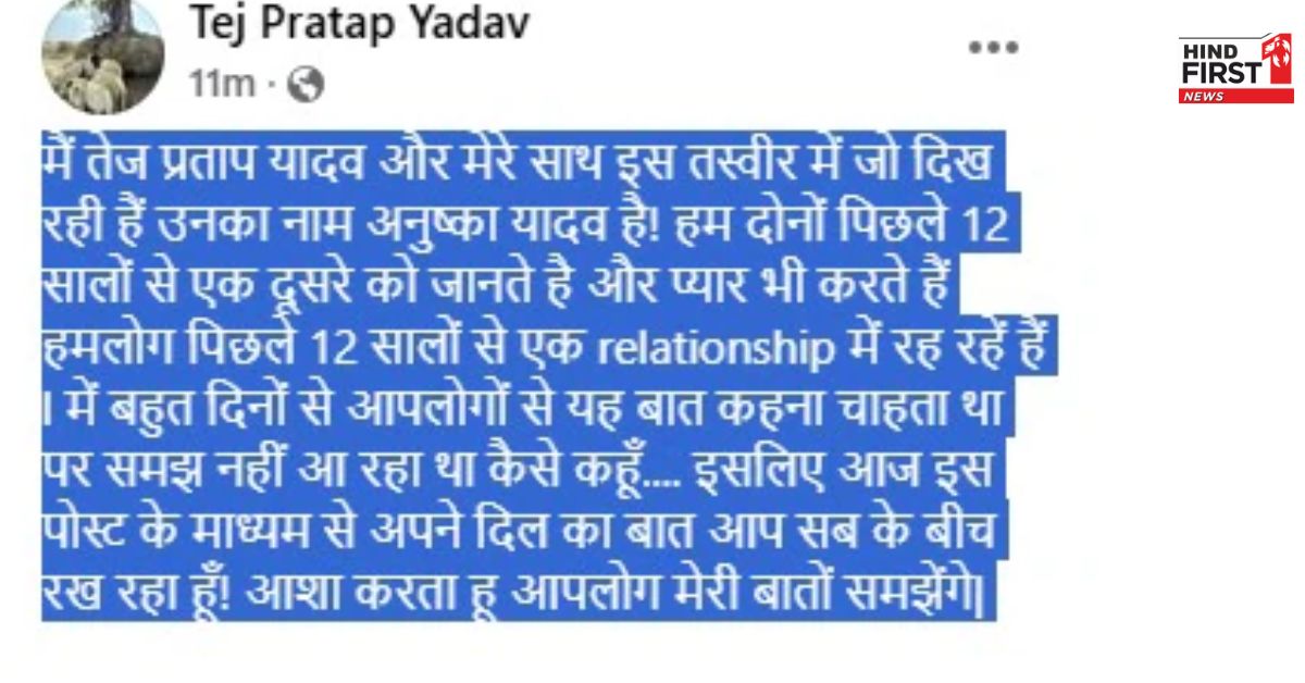 तेज प्रताप ने अपनी पोस्ट में लिखा, 'मैं तेज प्रताप यादव और मेरे साथ इस तस्वीर में जो दिख रही हैं, उनका नाम अनुष्का यादव है. हम दोनों पिछले 12 सालों से एक-दूसरे को जानते हैं और प्यार भी करते हैं. हमलोग पिछले 12 सालों से एक रिलेशनशिप में रह रहे हैं. मैं बहुत दिनों से आपलोगों से यह बात कहना चाहता था, पर समझ नहीं आ रहा था कैसे कहूं... इसलिए आज इस पोस्ट के माध्यम से अपने दिल की बात आप सबके बीच रख रहा हूं. आशा करता हूं आप लोग मेरी बातों को समझेंगे.'
