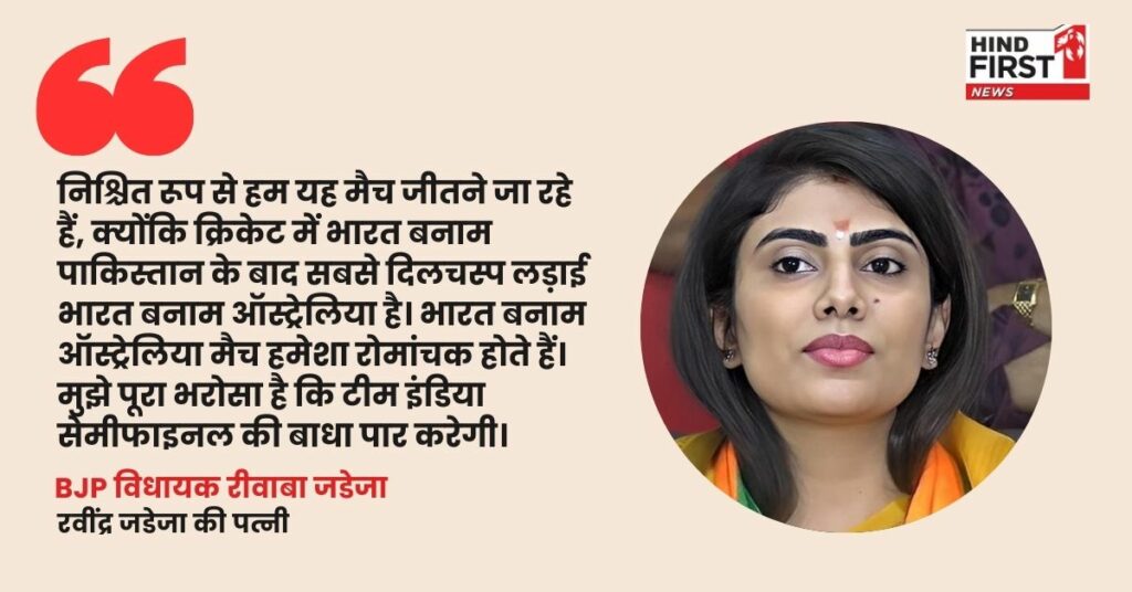 मैच से पहले रवींद्र जडेजा की पत्नी रीवाबा जडेजा ने आत्मविश्वास से भरा बयान देते हुए कहा कि टीम इंडिया पूरी तरह से तैयार है और इस बार सेमीफाइनल में ऑस्ट्रेलिया को मात देकर फाइनल में पहुंचेगी। उन्होंने कहा, "भारत बनाम पाकिस्तान मुकाबले की तरह ही भारत बनाम ऑस्ट्रेलिया मैच भी बेहद खास होता है। हम पिछले कुछ सालों से देख रहे हैं कि यह मुकाबला हमेशा रोमांच से भरपूर रहता है। पूरे भारत को टीम पर भरोसा है कि इस बार हम सेमीफाइनल जीतकर फाइनल में प्रवेश करेंगे।"