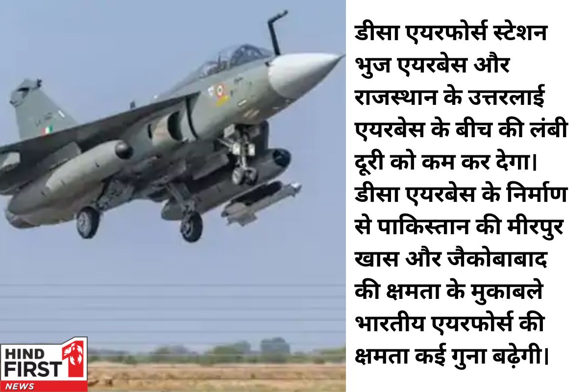 भारत-पाकिस्तान बॉर्डर पर एक नया एयरबेस, डीसा एयरफील्ड, बनाया जा रहा है। यह एयरफील्ड पाकिस्तान सीमा से महज 130 किलोमीटर की दूरी पर होगा, जिससे वायुसेना के फाइटर जेट जरूरत पड़ने पर यहां से तेजी से हमले कर सकेंगे। यह एयरफील्ड गुजरात के बनासकांठा में स्थित होगा और यह भारतीय वायुसेना का 52वां स्टेशन बनेगा। इस एयरफील्ड का निर्माण देश की सुरक्षा और क्षेत्र के विकास के लिए बहुत महत्वपूर्ण साबित होगा।
