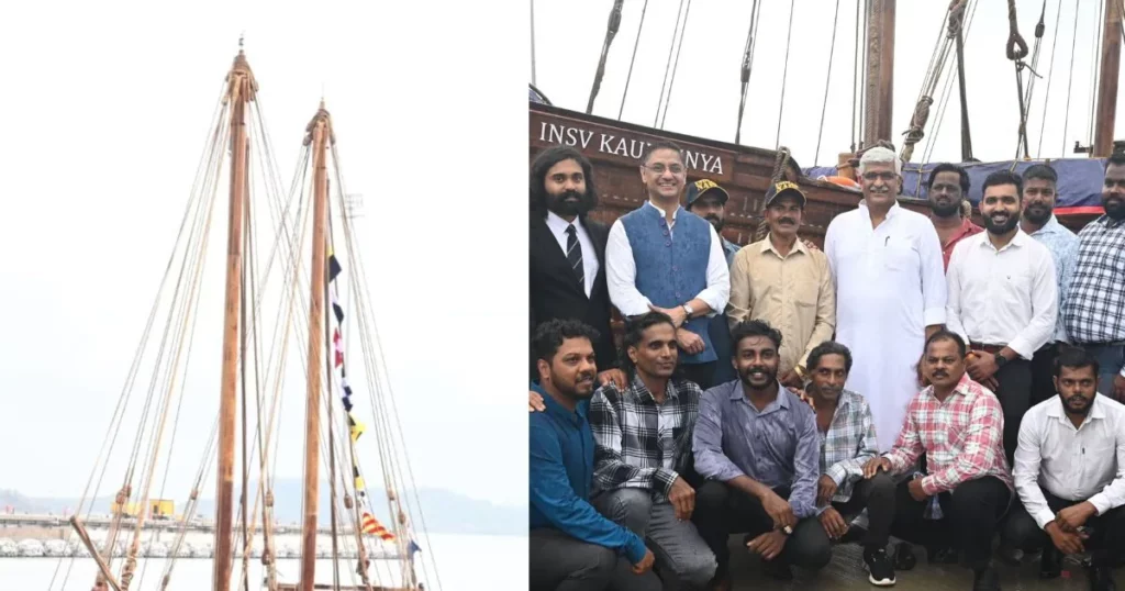 INSV कौंडिन्य, नारियल की रस्सियों और लकड़ी से बना पारंपरिक स्टिच्ड शिप, नौसेना में शामिल। यह 5वीं सदी की समुद्री परंपरा का प्रतीक है।
