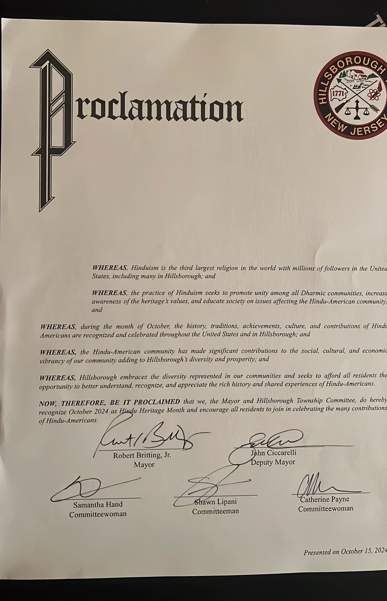 हिल्सबरो, न्यू जर्सी में 15 अक्टूबर को आयोजित टाउनशिप कमिटी मीटिंग में मेयर रॉबर्ट ब्रिटिंग ने हिन्दू समुदाय के सदस्यों को एक महत्वपूर्ण मान्यता प्रदान की। इस अवसर पर, अक्टूबर माह को 'हिन्दू धरोहर माह' के रूप में मान्यता देने की घोषणा की गई। इसके साथ ही मेयर ने हिन्दू समुदाय द्वारा अमेरिका और विशेष रूप से हिल्सबरो में किए गए योगदान को सराहा और इसे मान्यता दी।