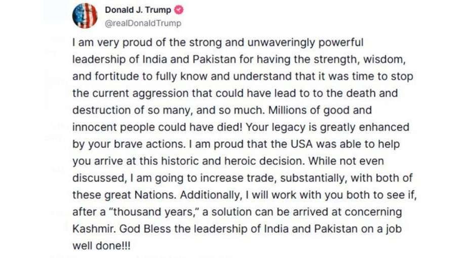 डोनाल्ड ट्रंप ने अपने पोस्ट में लिखा कि उन्हें भारत और पाकिस्तान के नेतृत्व पर गर्व है जिन्होंने युद्ध रोकने का सही फैसला लिया। उन्होंने दावा किया कि यह संघर्ष लाखों निर्दोष लोगों की जान ले सकता था और अमेरिका ने इस सीजफायर में महत्वपूर्ण भूमिका निभाई।