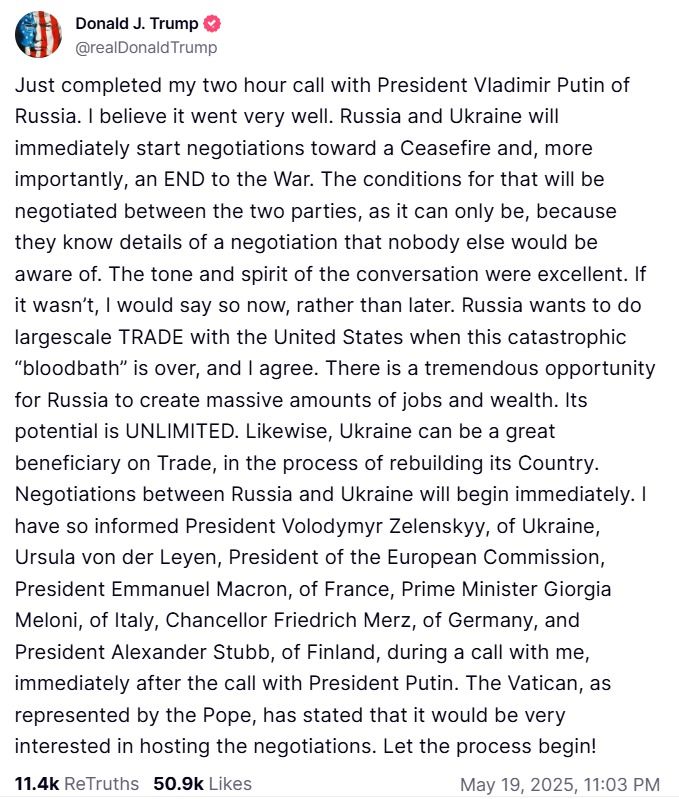 ट्रंप ने अपने सोशल मीडिया प्लेटफॉर्म 'ट्रुथ सोशल' पर लिखा कि उनकी पुतिन के साथ हुई बातचीत "बेहद सकारात्मक" रही। उन्होंने कहा कि "रूस और यूक्रेन अब सीजफायर पर सहमत होने के लिए तैयार हैं, साथ ही युद्ध समाप्त करने की शर्तों पर भी बातचीत शुरू करेंगे।" ट्रंप ने यह भी उजागर किया कि पुतिन अमेरिका के साथ व्यापारिक संबंध बढ़ाना चाहते हैं, जिसे वे "रूस के लिए एक बड़ा अवसर" मानते हैं। हालांकि, ट्रंप ने यह भी स्वीकार किया कि पुतिन यूक्रेन से जुड़ी अपनी कुछ शर्तों पर अडिग हैं, जिससे वार्ता की राह मुश्किल हो सकती है।