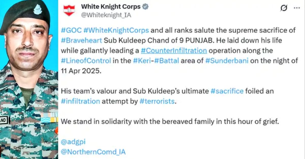 व्हाइट नाइट कोर ने ट्वीट कर उन्हें श्रद्धांजलि देते हुए लिखा, “GOC व्हाइट नाइट कोर और सभी सैनिक सूबेदार कुलदीप चंद की सर्वोच्च बलिदान को सलाम करते हैं। वे आतंकियों की घुसपैठ रोकने के लिए चलाए गए ऑपरेशन का नेतृत्व करते हुए वीरगति को प्राप्त हुए।”