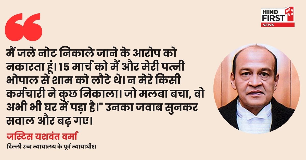 जस्टिस वर्मा ने लिखित जवाब में साफ कहा कि मुझे स्टोर रूम में कैश होने की कोई जानकारी नहीं थी। न मुझे, न मेरे परिवार को और न ही कर्मचारियों को इसकी भनक थी।" दूसरे सवाल पर उन्होंने कहा, "जब मुझे कैश के बारे में पता ही नहीं, तो सोर्स कैसे बताऊं?" तीसरे सवाल पर बोले, "मैं जले नोट निकाले जाने के आरोप को नकारता हूं। 15 मार्च को मैं और मेरी पत्नी भोपाल से शाम को लौटे थे। न मेरे किसी कर्मचारी ने कुछ निकाला। जो मलबा बचा, वो अभी भी घर में पड़ा है।" उनका जवाब सुनकर सवाल और बढ़ गए।
