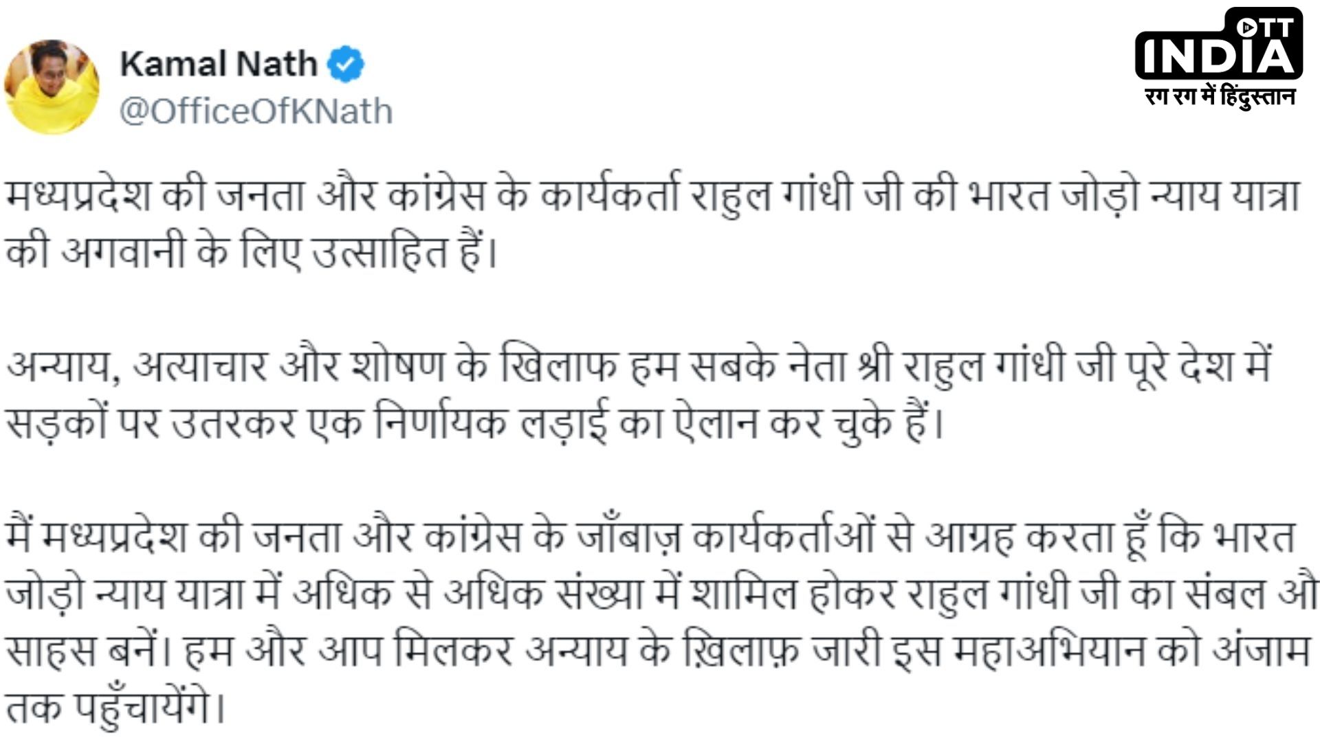 अपनी पोस्ट में कमलनाथ ने प्रदेश की जनता से (KAMALNATH MESSAGE TO MP) राहुल गांधी की भारत जोड़ो न्याय यात्रा में शामिल होने की अपील की. उन्होंने कहा कि राहुल गांधी देश में अन्याय, अत्याचार और शोषण के खिलाफ सड़कों पर उतरे हैं. अब उनका समर्थन करने का समय आ गया है।' https://twitter.com/RahulGandhi/status/1755149975582085262?ref_src=twsrc^tfw|twcamp^tweetembed|twterm^1755149975582085262|twgr^cd24c4a36e787a32869ea390cc516c00577df262|twcon^s1_&ref_url=https://www.gujaratfirst.com/all/national-all/kamalnath-message-to-mp-congress-leader-kamal-nath-announced-a-message-for-rahul-gandhi/ऐसी अफवाहें थीं कि कमल नाथ भाजपा में शामिल होंगे