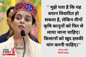 हिमाचल प्रदेश के मंडी में अपने निर्वाचन क्षेत्र में पत्रकारों से बात करते हुए अभिनेत्री से नेता बनीं कंगना ने कहा, "मुझे पता है कि यह बयान विवादित हो सकता है, लेकिन तीनों कृषि कानूनों को फिर से लाया जाना चाहिए। किसानों को खुद इसकी मांग करनी चाहिए।" कंगना रनौत ने कहा, ''किसान देश के विकास में एक मज़बूत स्तंभ हैं। मैं उनसे अपील करना चाहती हूं कि वे अपनी भलाई के लिए इन कानूनों को वापस लाने की मांग करें।''